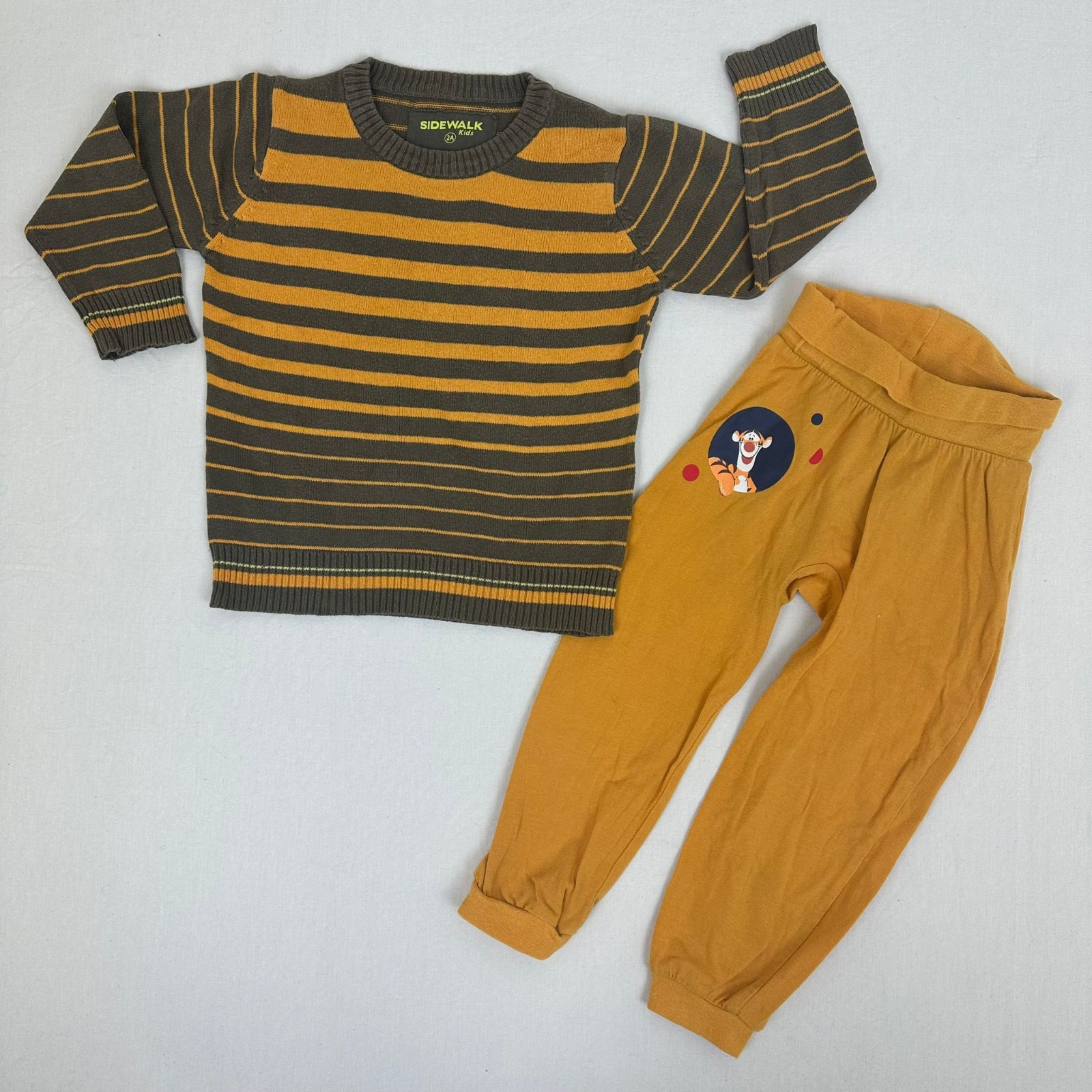 Autres commentaires : Pull Sidewalk marron à rayures jaunes.Pantalon disney legging jaune à taille élastiquée avec motif disney.