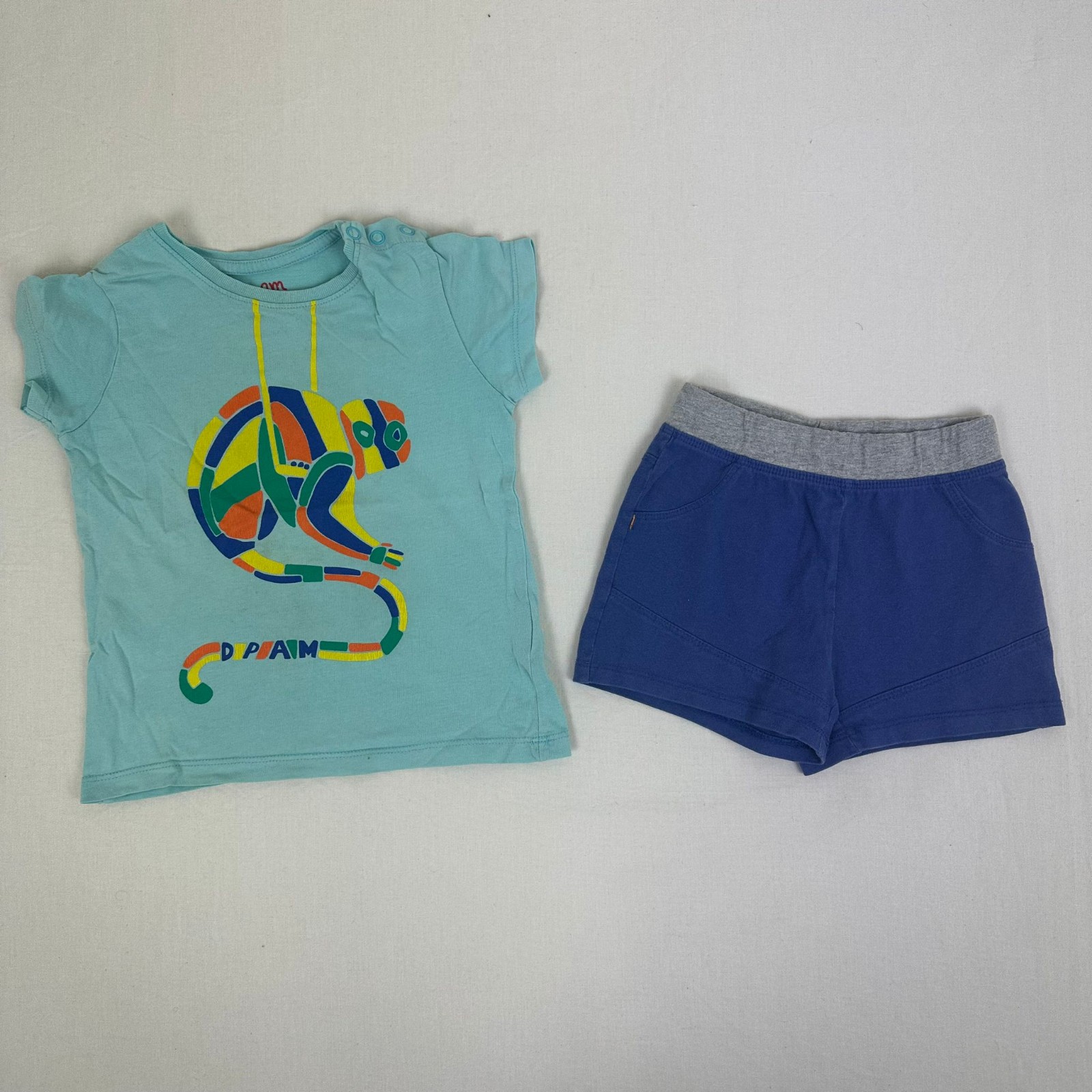 Autres commentaires : T-shirt manches courtes bleu clair Du pareil au même avec une fermeture par boutons pressions au niveau de l’épaule. Short Lupilu bleu avec taille élastiquée.