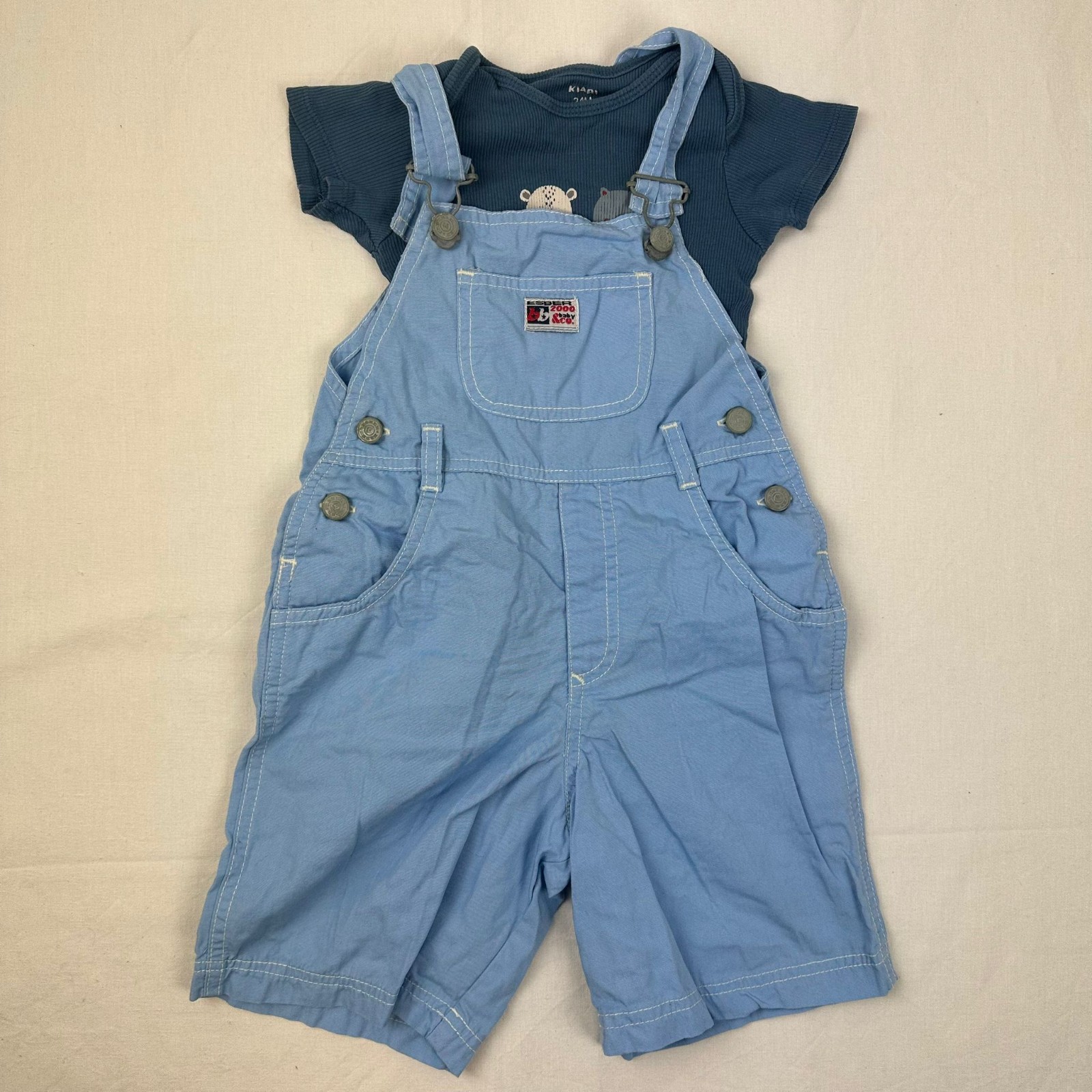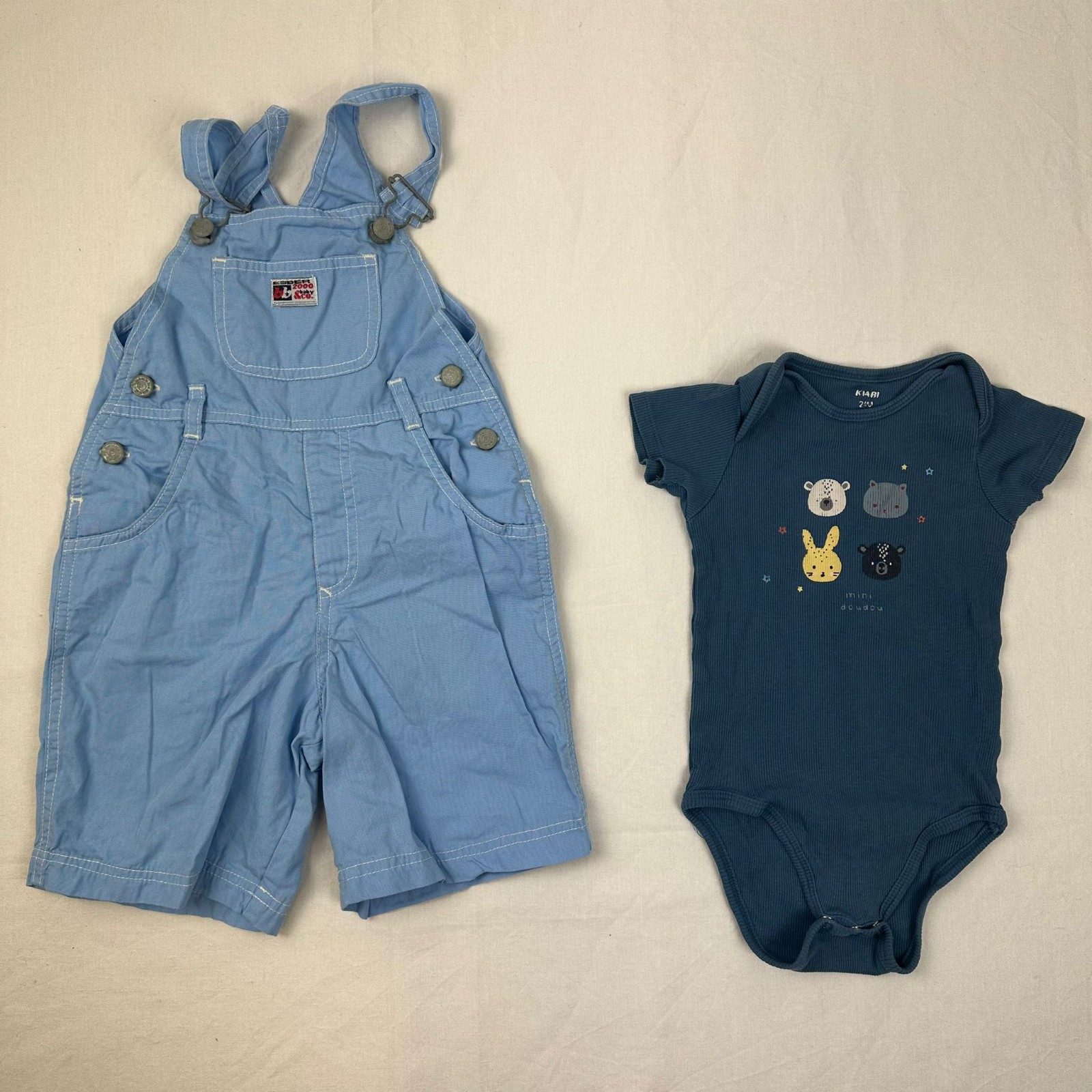 Autres commentaires : Body Kiabi manches courtes bleu. Salopette bleu Esber avec manches en bretelles ajustables.
