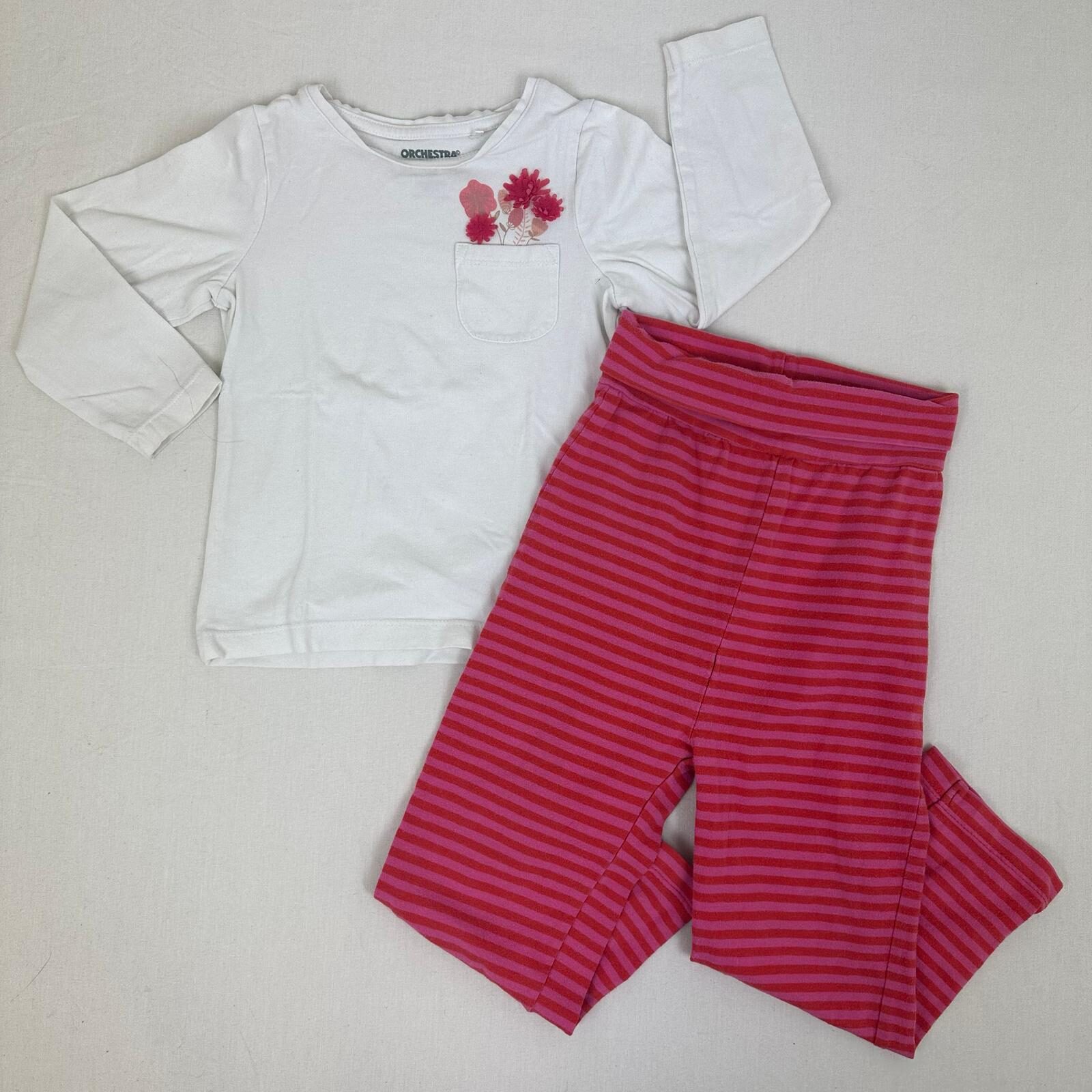 Autres commentaires : 5% elasthanne.T-shirt blanc Orchestra manches longues avec une fleur comme motif.Legging rouge et rose Du pareil au même à rayures.