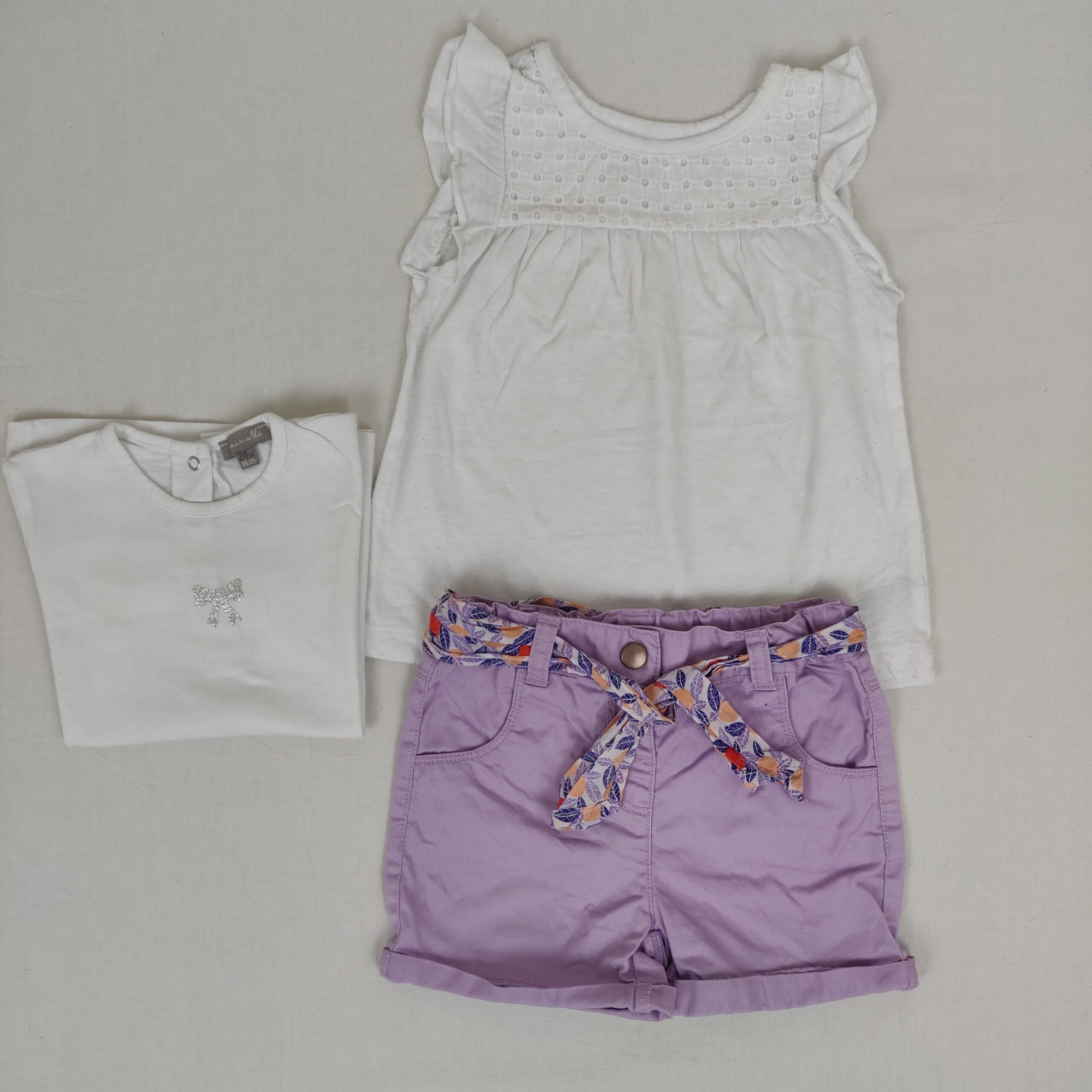 Autres commentaires : Short violet Kidkanai avec taille élastiquée et ceinturée. T-shirt manches courtes Cherakee blanc. T-shirt manches courtes Grain de blé blannc avec 2 petites tâches( offerte).