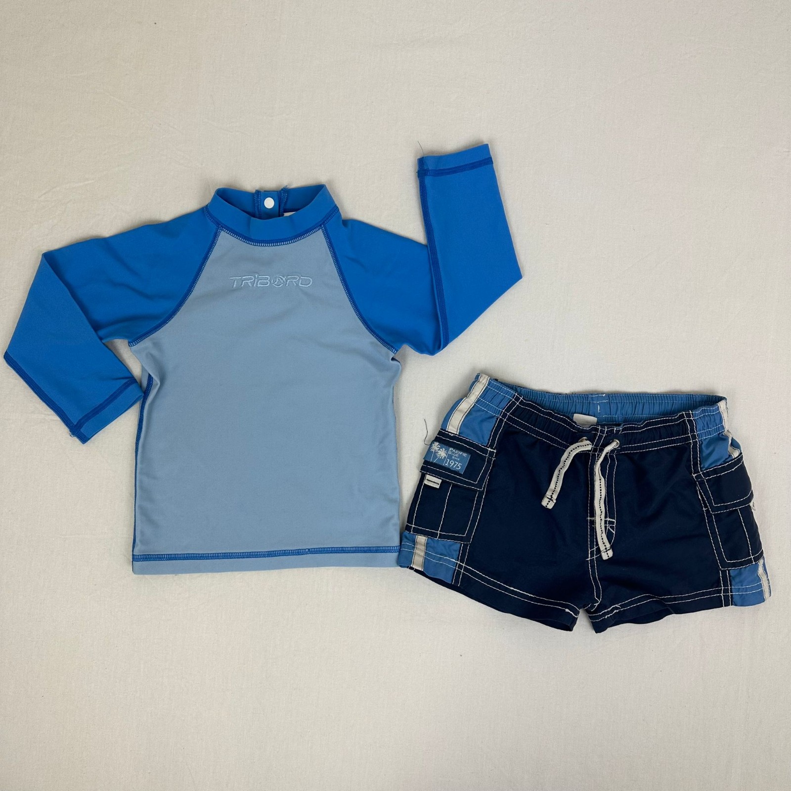 Autres commentaires : 20% elasthanne. T-shirt Decathlon manches longues avec une fermeture par boutons pressions au dos. Short Zara bleu foncé avec taille élastiquée.