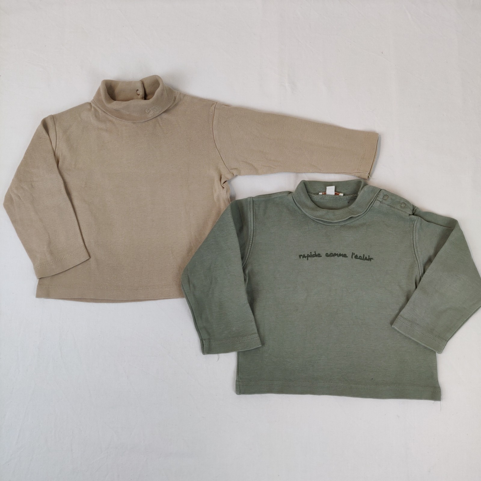 Autres commentaires : T-shirts col roulé beige et kaki avec petit défaut sur le beige et quelques tâches à l’arrière.