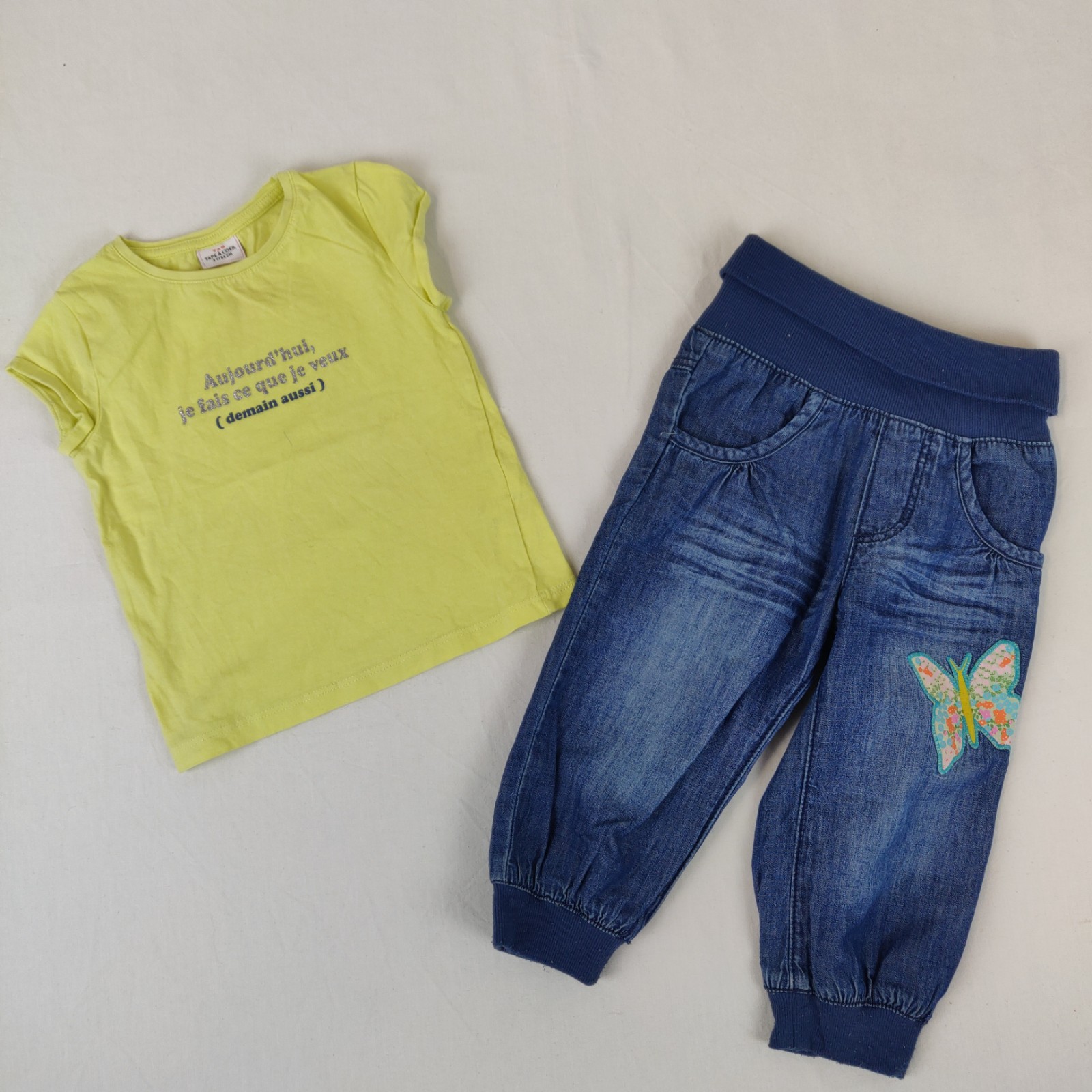 Autres commentaires : Ensemble 2 pièces. Un t-shirt à manches courtes Tape à l’oeil – jaune-vert. Inscription centrale argentée et bleu marine « Aujourd’hui je fais ce que je veux (demain aussi) ». Tâche d’encre verte sur le devant. Un pantalon H&M – bleu. Motif latéral gauche papillon multicolore brodé. Taille et chevilles façon tricot élastique bleu. Marques d’usure au niveau des jambes.