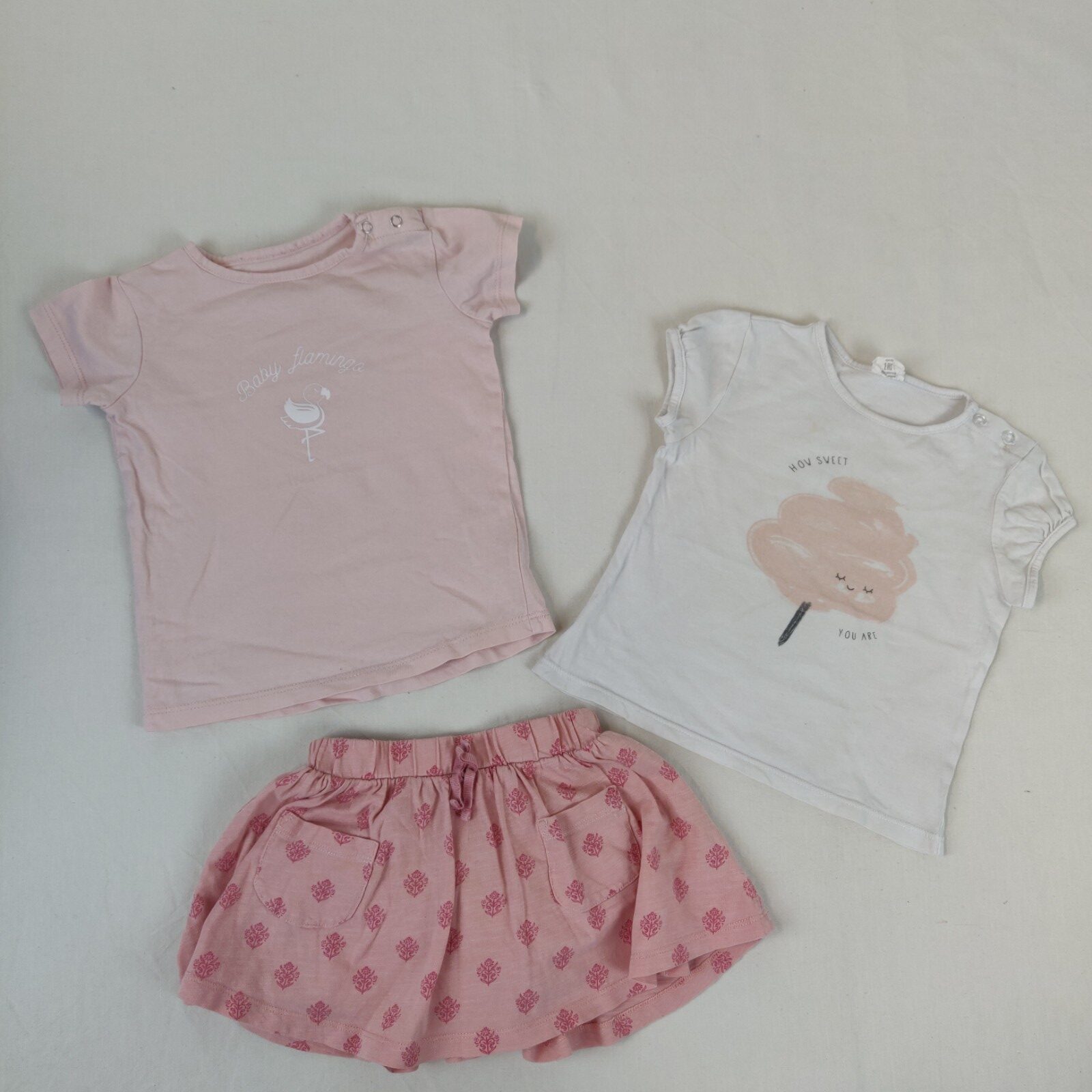 Autres commentaires : Ensemble 2 pièces. Un t-shirt Boîte à malices – rose. Motif central flamant rose blanc. Ouverture latérale à 2 pressions. Une jupe shorty Delta Chill out – rose à motifs floraux fushia. 2 poches centrales. Taille élastique. Un petite tâche orangée discrète au niveau de la poche. Un t-shirt Kiabi – blanc offert. Motif central barbe à papa accompagné de l’inscription « How sweet you are ». Ouverture latérale à 2 boutons. 2 tâches marrons centrales.