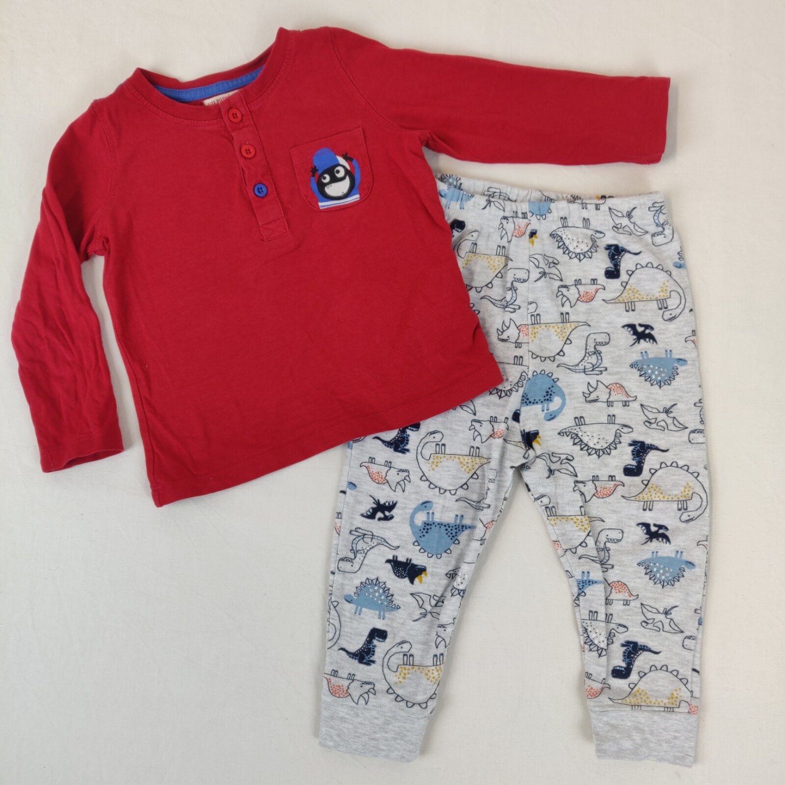 Autres commentaires : Ensemble 2 pièces. Un t-shirt à manches longues Du pareil au même – rouge. Pochette centrale décorée d’un petit monstre. Ouverture centrale à 3 boutons. Un pantalon de jogging Primark – gris chiné. Motifs dinosaures multicolores. Taille et chevilles élastiques.