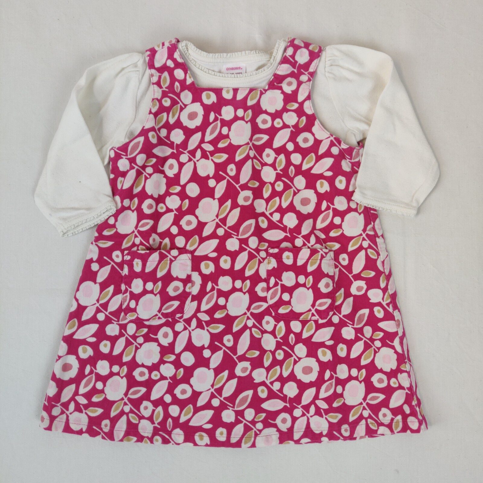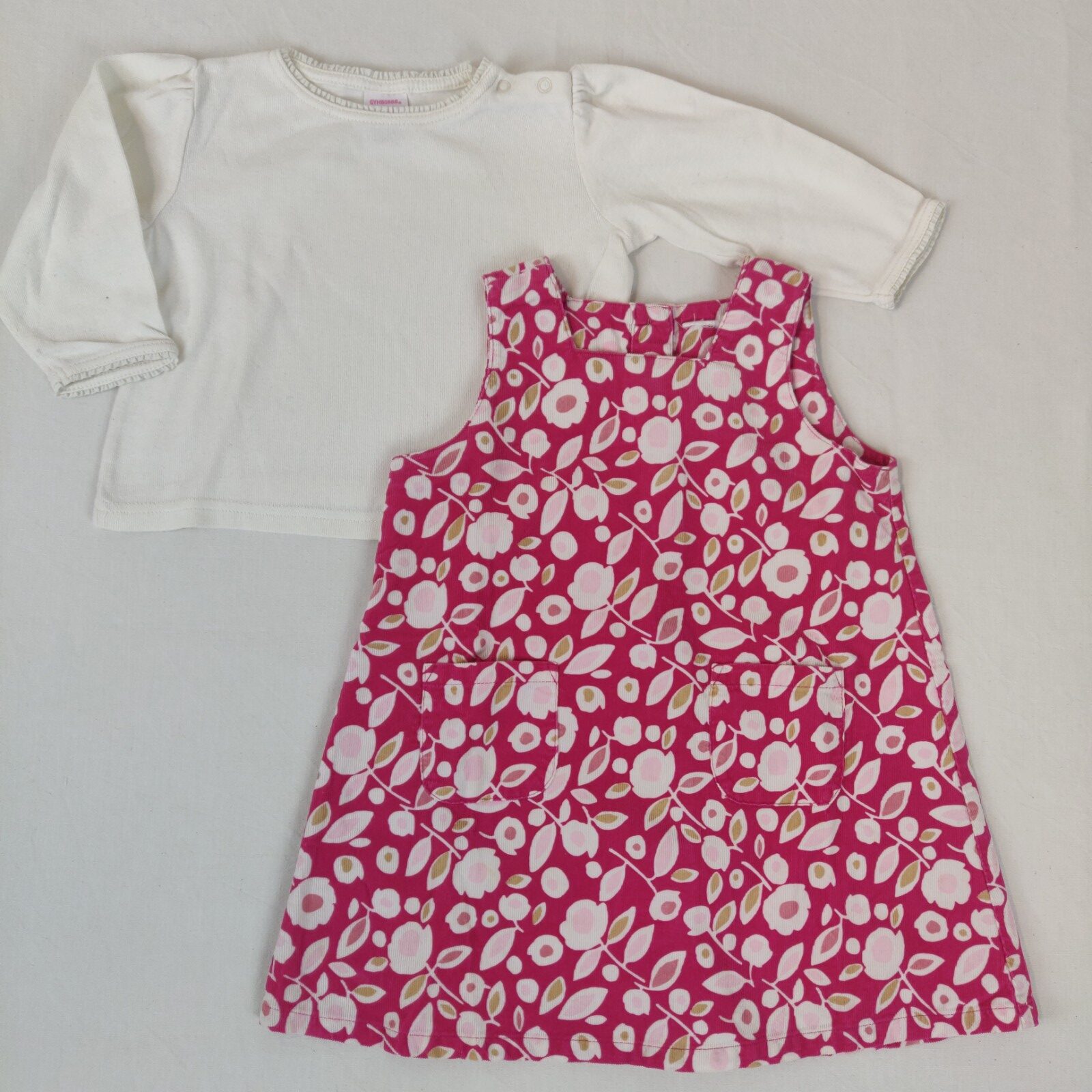 Autres commentaires : Ensemble 2 pièces. Un t-shirt à manches longues Gymboree – écru. Col légèrement froncé. Ouverture latérale à 2 pressions. Robe sans manche en velours finement cotelé – rose à larges motifs floraux blancs, roses et marrons. 2 poches centrales. Ouverture centrale au dos à boutons.