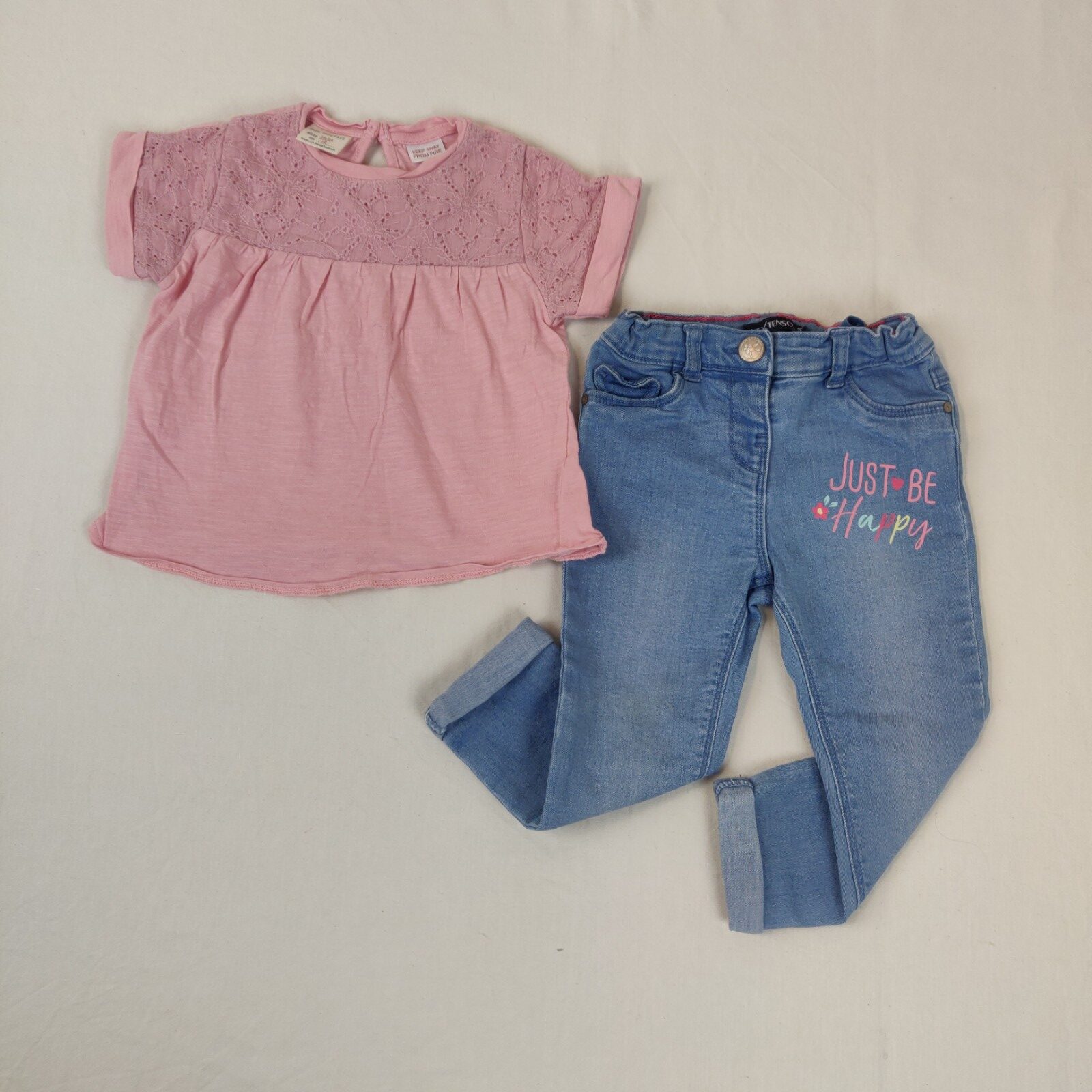 Autres commentaires : 2% élasthanne. Ensemble 2 pièces. Un t-shirt à manches courtes Zara – rose. Partie centrale confectionnée en broderie anglaise. Ouverture centrale au dos à un bouton. Jean In extenso en denim bleu. Inscription latérale « Just be happy ». Taille ajustable. 2 poches latérales et 2 poches arrières. Passants pour une ceinture. Chevilles retroussées.