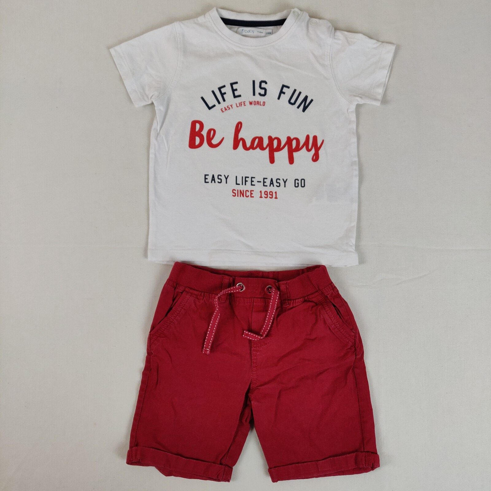 Autres commentaires : 3% élasthanne. Ensemble 2 pièces. un t-shirt à manches courtes Gémo – blanc avec inscription centrale bleu marine et rouge « Life is fun. Easy life world. Be happy. Easy life- easy go since 1991 ». Ouverture latérale à 2 pressions. Bermuda Vert Baudet – rouge. Taille élastique rouge avec cordon interne rougee et blanc. 2 poches latérales et 2 poches arrières en trompe-l’oeil. Usure normale du vêtement.