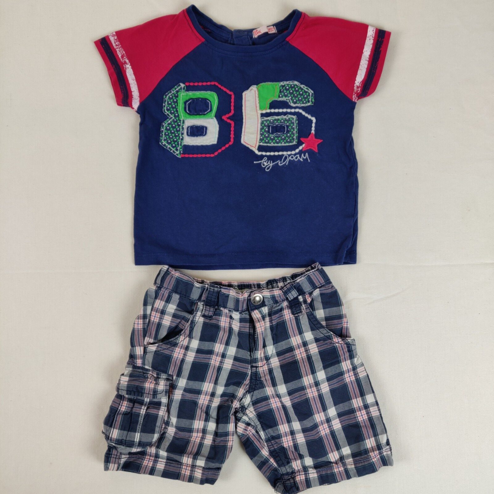 Autres commentaires : Ensemble 2 pièces. Un t-shirt à manches courtes Du pareil au même – bleu marine aux manches rouges. Motif central piqué multicolore « 86 ». Ouverture centrale au dos à 3 pressions. Bermuda Vertbaudet à motifs écossais bleu-gris, écrus, roses et gris. Taille élastique. 3 poches latérales dont une à rabat. Une poche arrière en trompe-l’oeil.