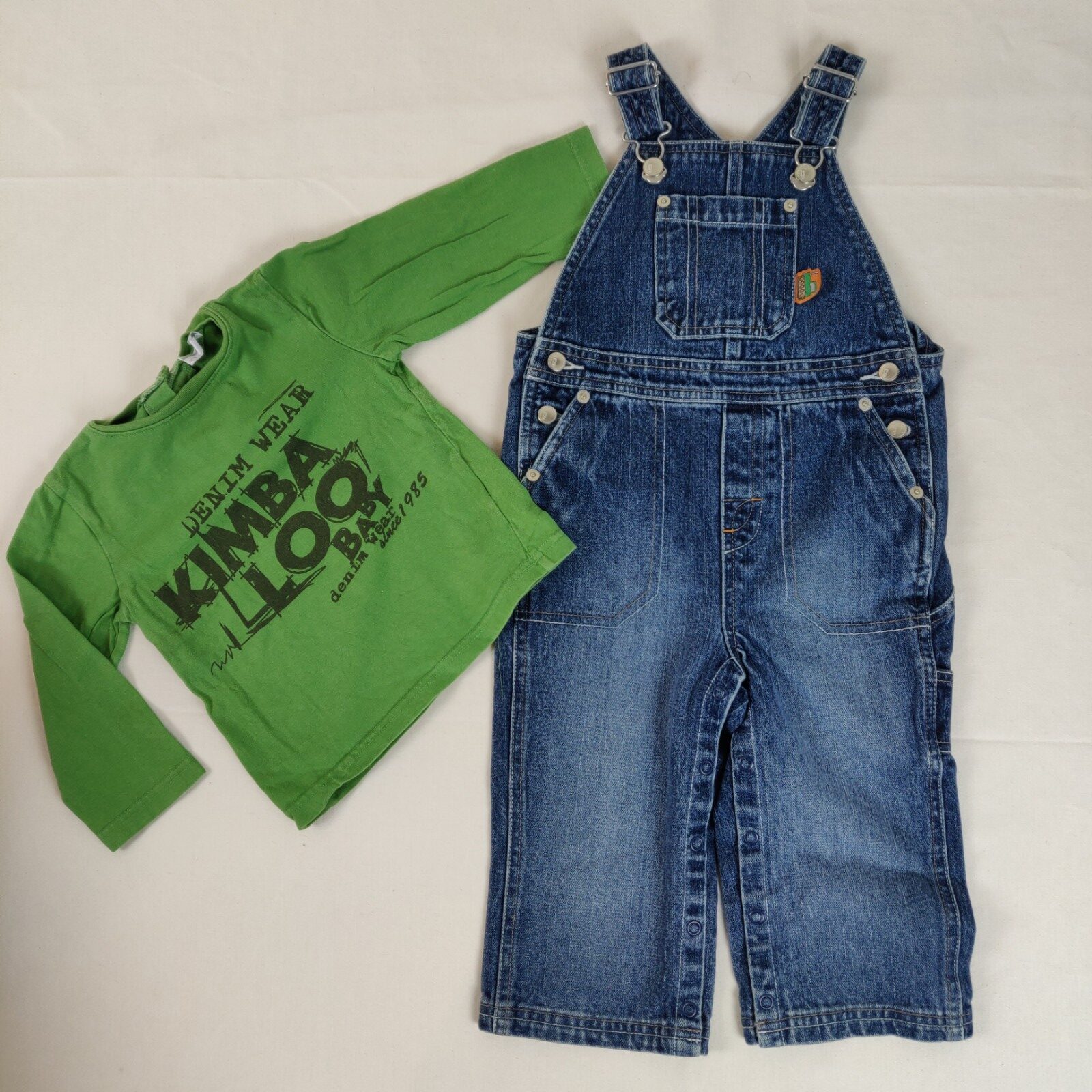 Autres commentaires : Ensemble 2 pièces. Un t-shirt à manches longues Kimbaloo – vert avec inscription centrale noire « denim wear Kimbaloo Baby. Denim wear since 1985 ». Ouverture centrale au dos à 2 pressions. Salopette en denim bleu. Bretelles à attaches réglables classiques. Une pochette centrale ornée d’un écusson latéral orange avec un tracteur chenille. Ouvertures latérales à 2 boutons. Ouverture à l’entrejambe à pressions. 2 poches latérales et 2 poches arrières. Marques d’usure au niveau des jambes.