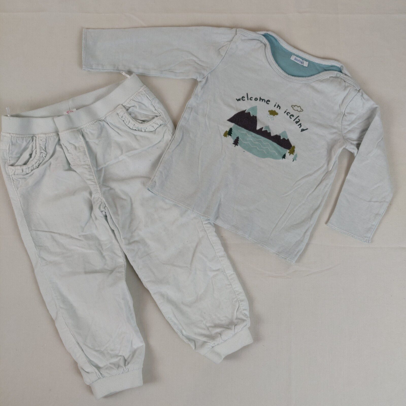 Autres commentaires : Ensemble 2 pièces. Un t-shirt à manches longues Bout’chou – balnc avec motif central paysage de montagnes accompagné de l’inscription « Welcome in Iceland ». Ouvertures latérales à une pression. Très léger effet pelucheux. Un pantalon C&A en velours finement côtelé blanc. Taille et chevilles façon tricot élastique. 2 poches latérales.