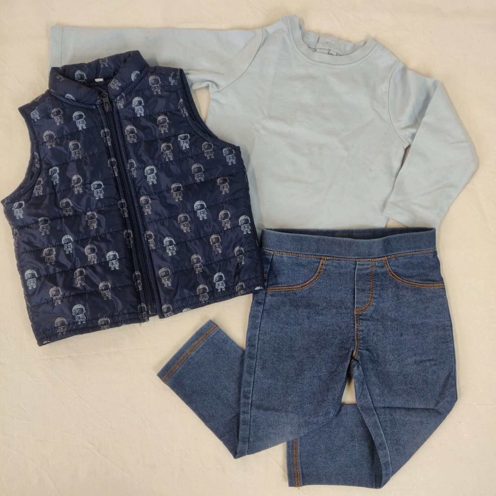 Autres commentaires : 29% polyester, 2% élasthanne. Jegging Grain de blé – bleu. Taille ajustable. Coutures marrons apparentes. Usure normale du vêtement. Doudoune sans manche – bleu marine avec motifs petits cosmonautes bleu clair et gris. Ouverture centrale zippée. T-shirt à manches longues bleu clair offert. Taches marron clair sur le devant.