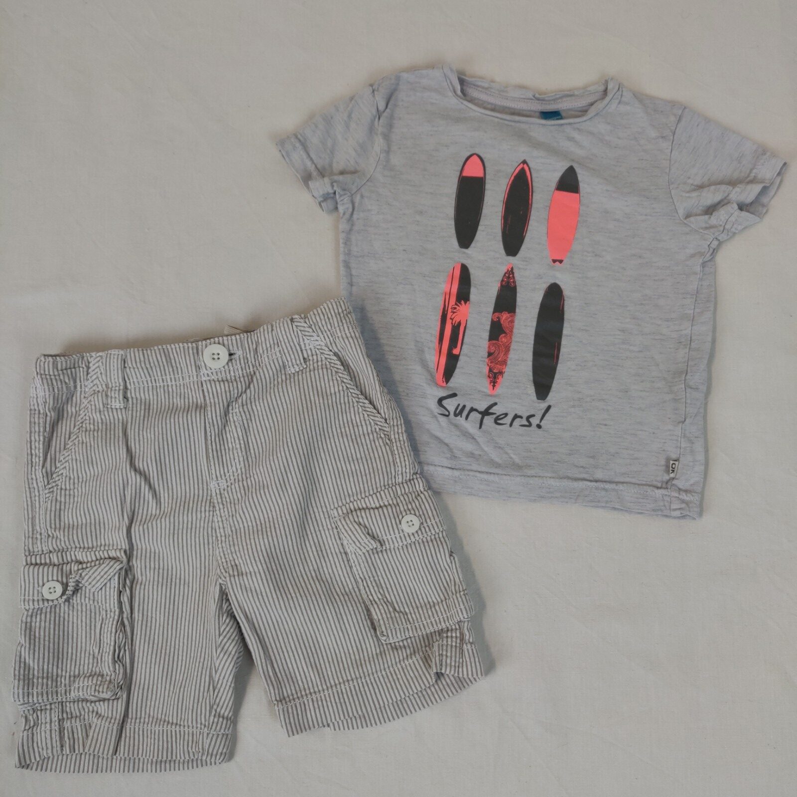 Autres commentaires : 0,5% viscose. Un t-shirt à manches courtes Okaïdi – gris chiné avec motifs gris et orange fluo planches de surf accompagnés de l’inscription « Surfers! ». Un bermuda Obaibi – blanc rayé marron clair. Taille ajustable. 2 poches latérales, 2 poches à rabat et 2 poches arrières en trompe-l’oeil. Passants pour une ceinture.