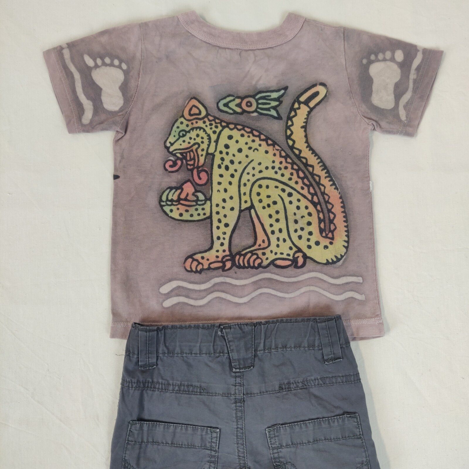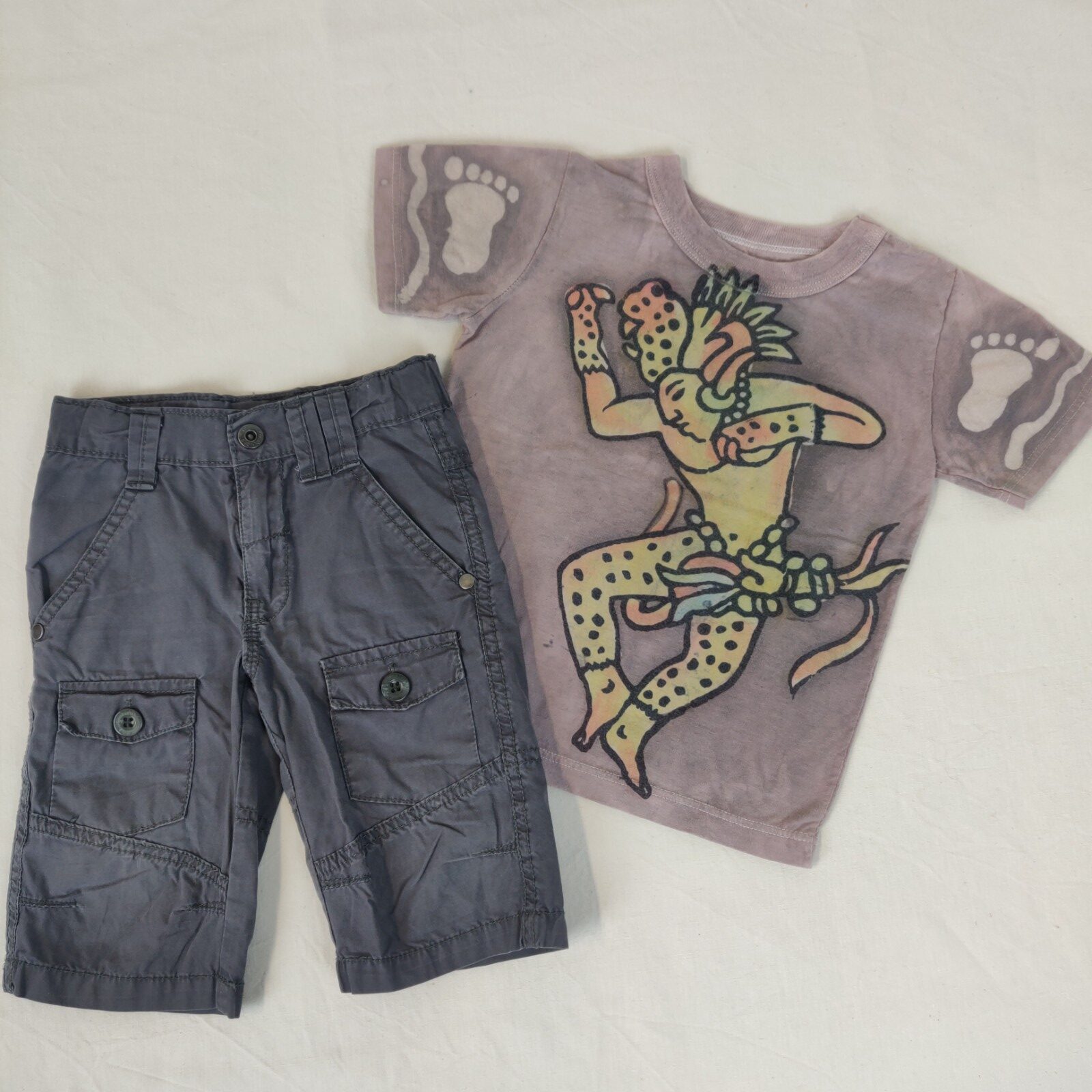 Autres commentaires : Ensemble 2 pièces. Un t-shirt sans marque à manches courtes – effet délavé marron. Motifs tribaux à l’avant et à l’arrière du vêtement. Un pantalon In Extenso – marron- gris foncé. Taille ajustable. 2 poches latérales, 2 poches centrales à rabat et 2 poches arrières. Passants pour une ceinture. Usure normale des vêtements.
