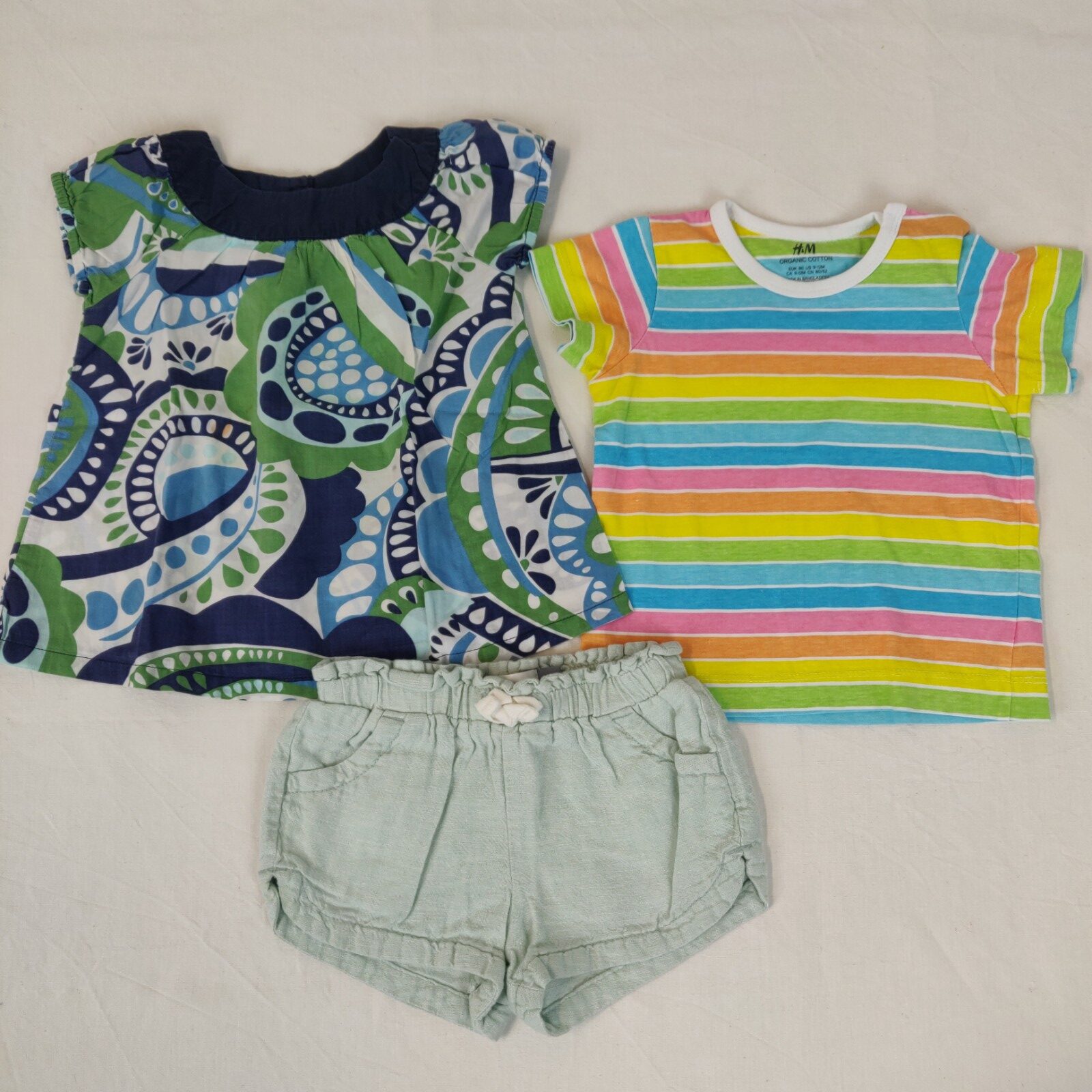 Autres commentaires : Coton biologique – Ensemble 2 pièces. Un t-shirt H&M à manches courtes rayé multicolore. Un short Old Navy – vert eau. Taille élastique avec cordon interne blanc. 2 poches latérales. Une blouse Gap à manches courtes offerte. Motifs floraux bleus et verts. Tâchée sur le devant.