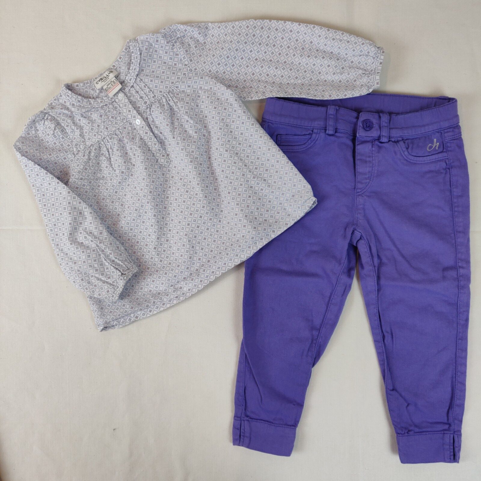 Autres commentaires : Pantalon marque Deha – parme – 4% élasthanne. Taille élastique, ouverture centrale à un bouton classique. 2 poches latérales et 2 poches arrières. Usure normale. Petite ouverture latérale aux chevilles. Passants pour une ceinture. Blouse à manches longues de marque Cyrillus – écru à motifs losanges gris et rouges. Ouverture centrale à trois boutons classiques comportant une très légère tâche jaune. Ouverture aux poignets à bouton classique.