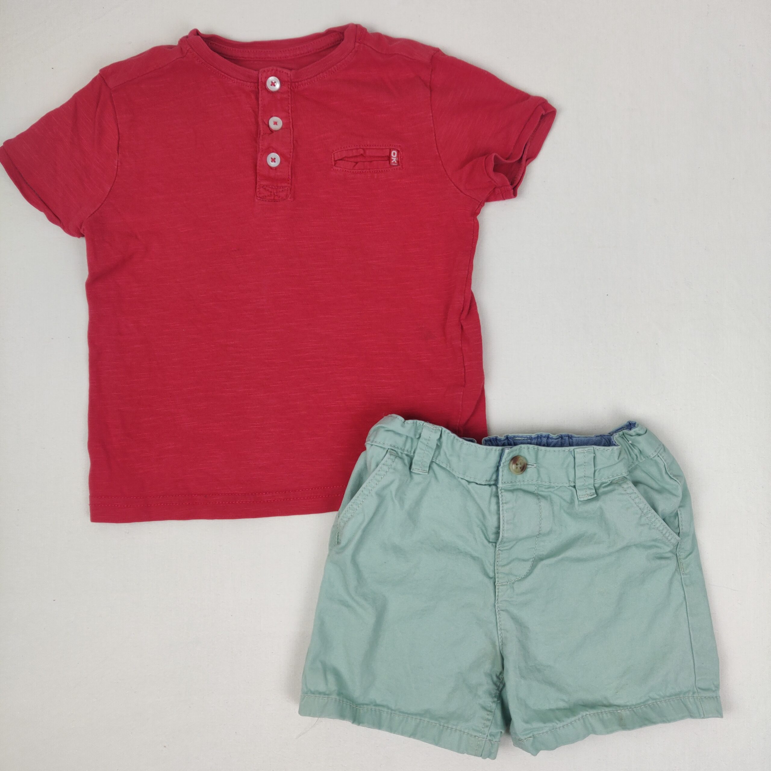 Autres commentaires : Short vert tilleul taille ajustable et fermeture avec 1 bouton – T-shirt rouge col rond avec ouverture centrale par 3 boutons