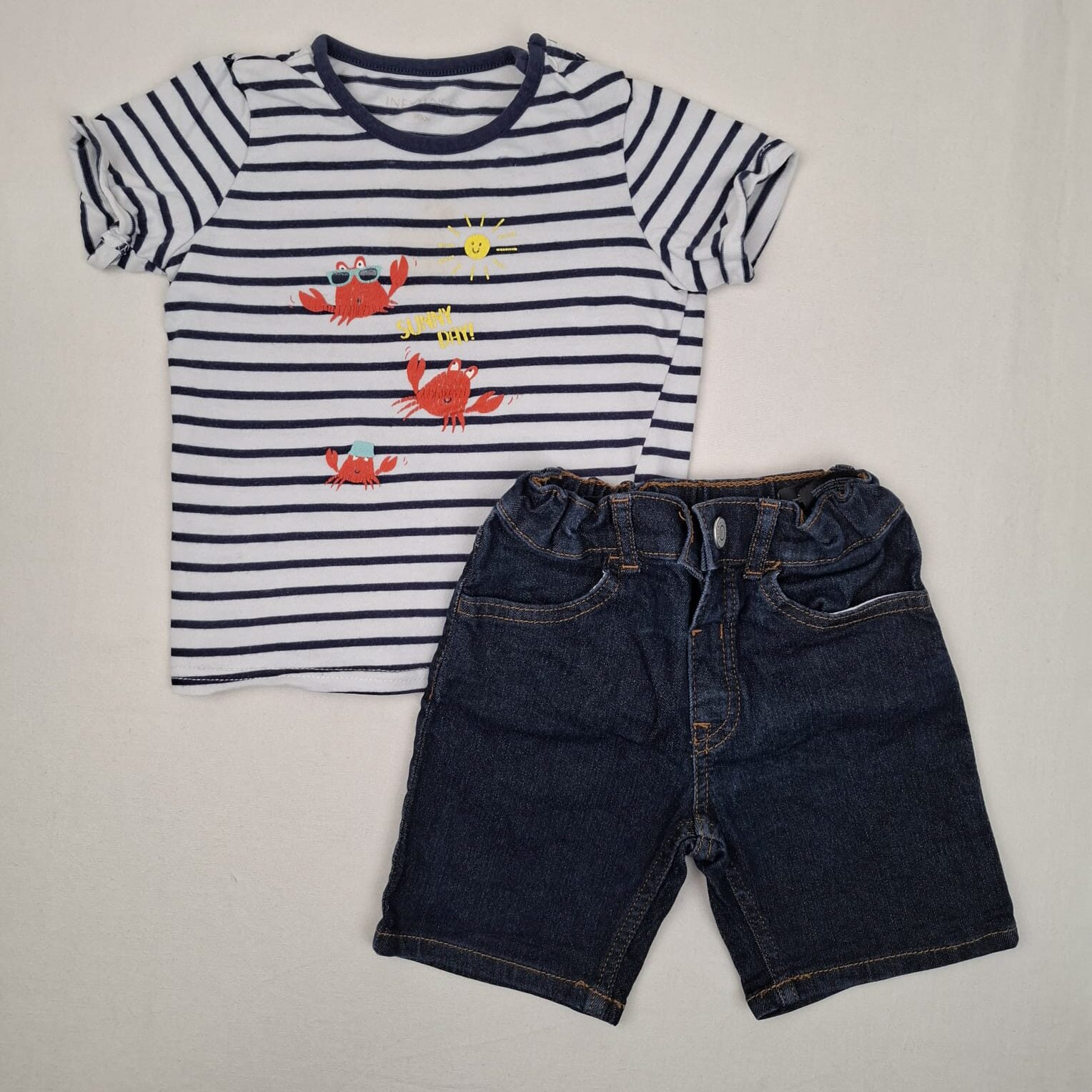 Autres commentaires : Ensemble 2 pièces : – T-shirt manches courtes, à rayures blanc et bleu, illustration crabe et soleil floqué à l’avant du vêtement, col rond avec deux. Short jean, taille élastiquée, élastique réglable, fermeture avec bouton pression.