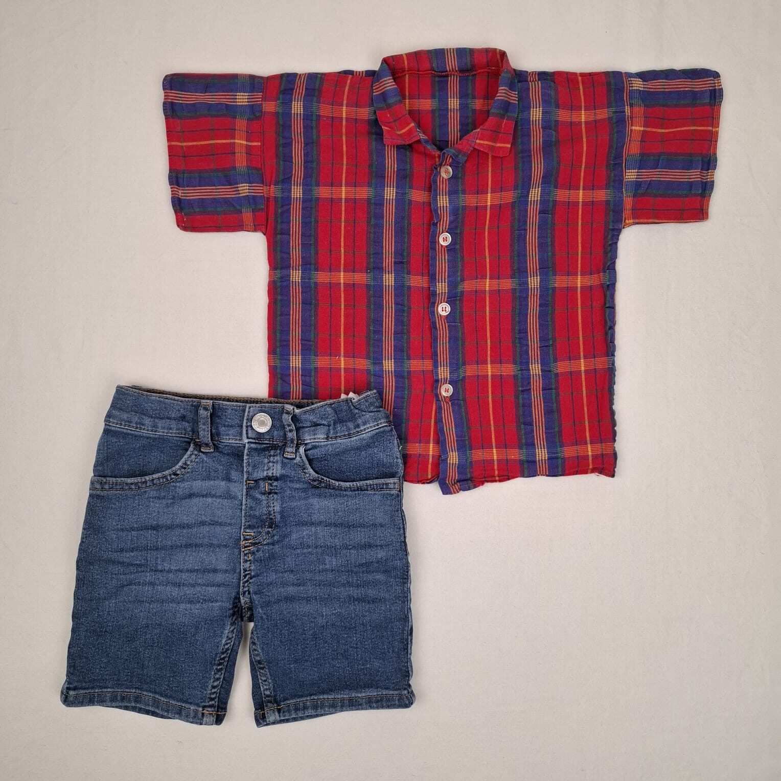 Autres commentaires : Ensemble 2 pièces T: – Chemise à carreaux rouge, vert, bleu et jaune, manches courtes, fermeture par boutons. Short jean bleu, monoprix, taille élastiqué, et élastique pour régler la taille