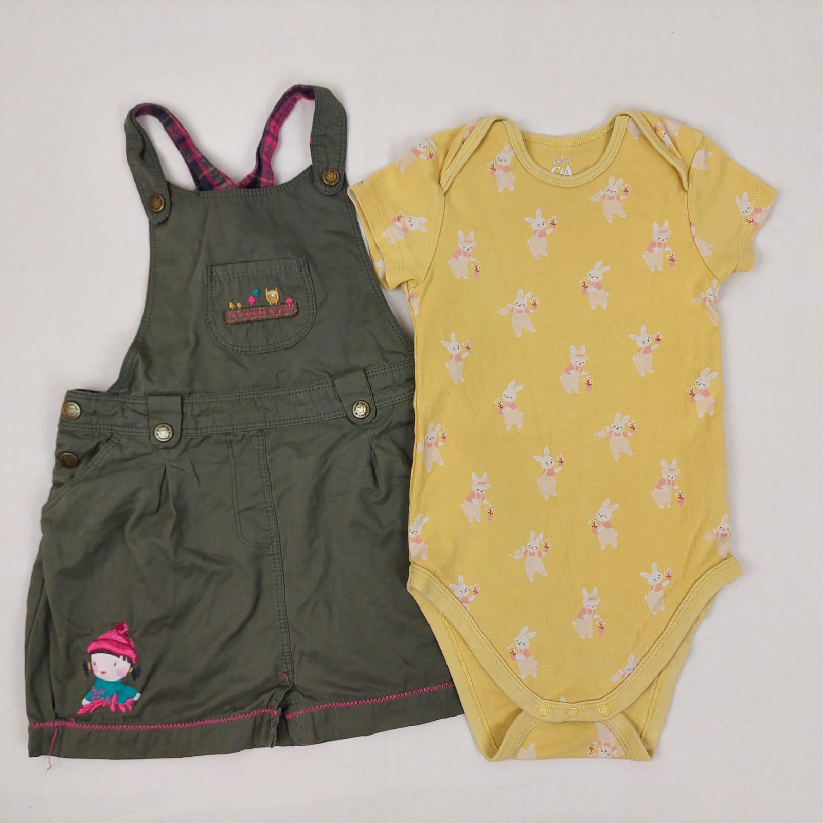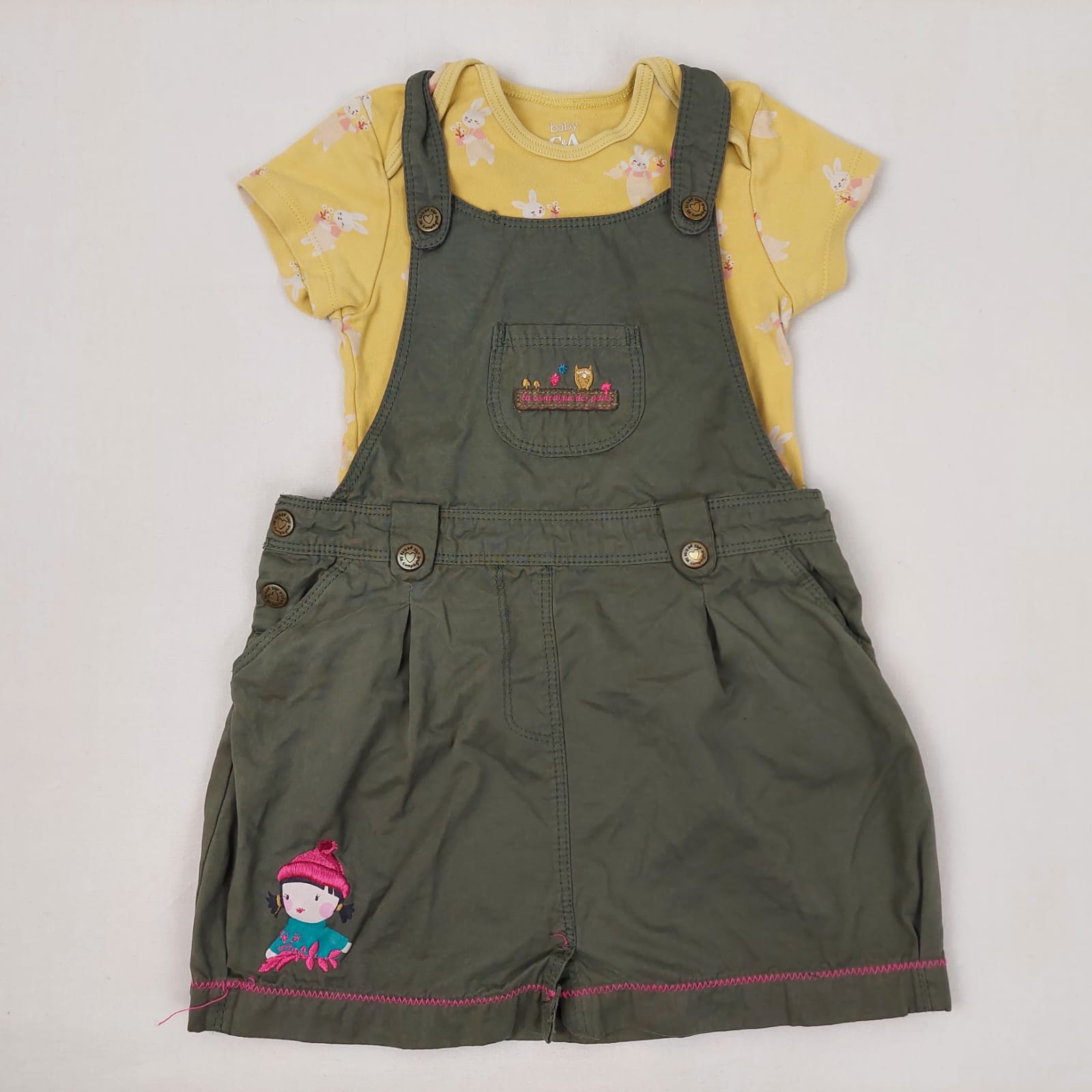 Autres commentaires : Robe salopette La Compagnie des Petits vert kaki, brodé à l’avant, polyester 41%, polyamide 10%, body C&A jaune, motifs lapin