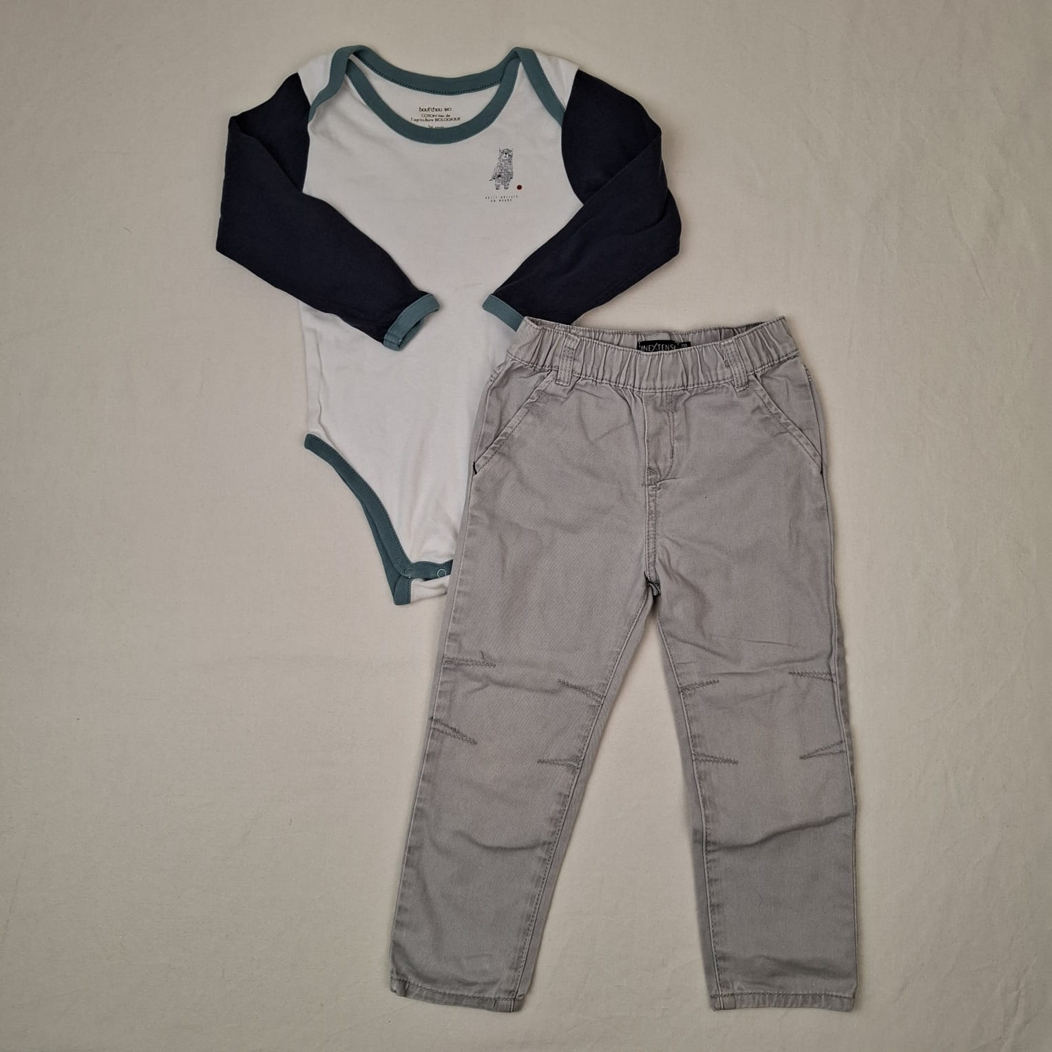 Autres commentaires : Ensemble 2 pièces: -Sweat KIABI en maille polaire gris, motif planètes, col rond, fermeture par boutons au dos, 23% polyester. -Pantalon slim VERTBAUDET gris, ceinture ajustable par élastique intérieur, 32% polyester, 1% élasthhane.