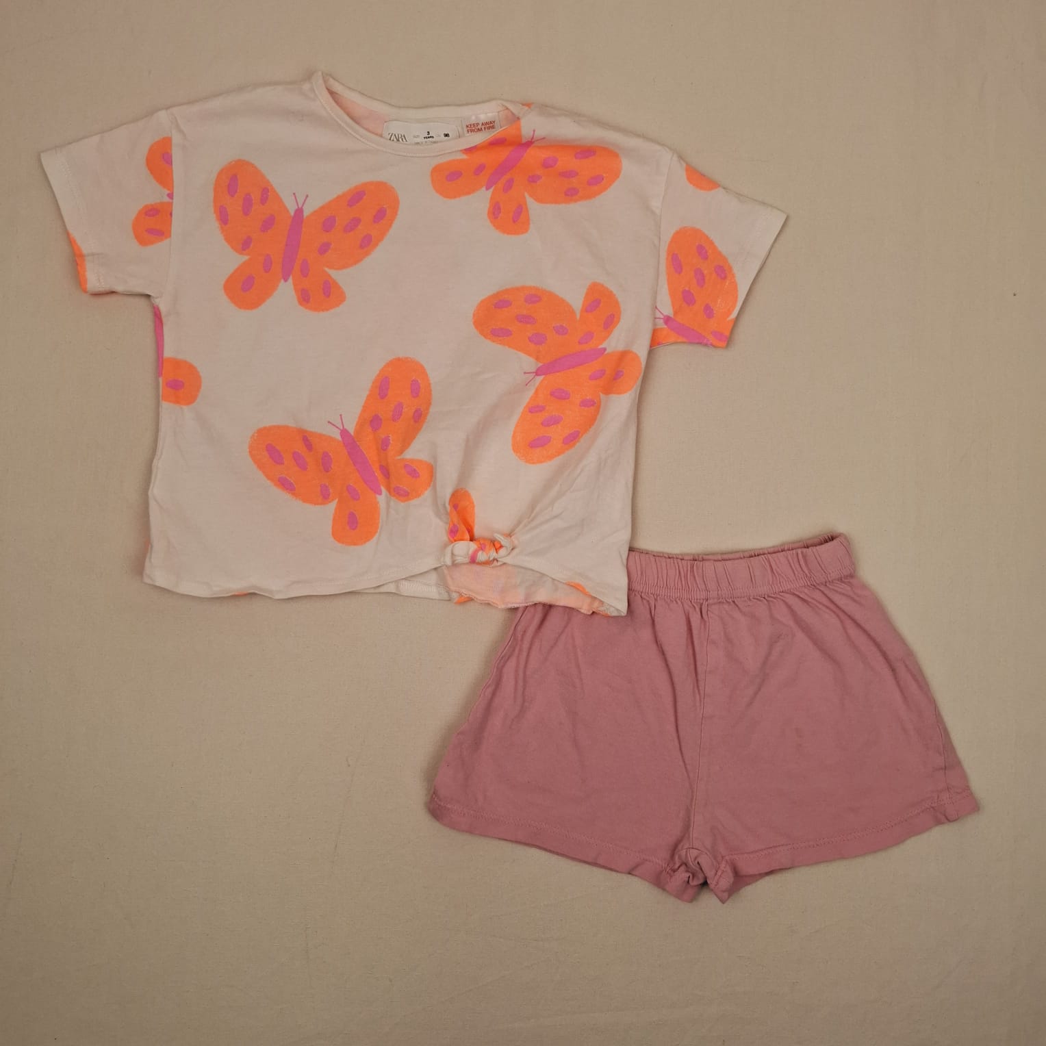 Autres commentaires : Ensemble 2 pièces: – T-shirt ZARA blanc à manches courtes, motifs papillons orange fluo, col rond, noeud en bas. – Short Despicable ME rose, taille élastique.