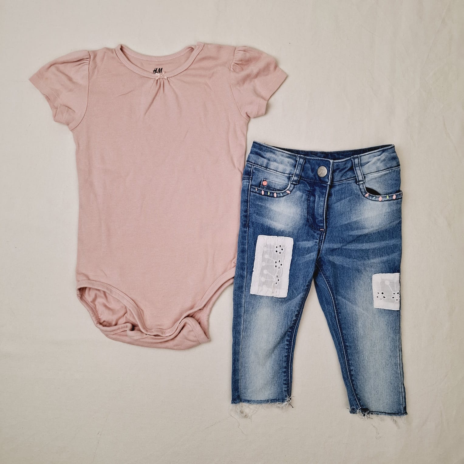 Autres commentaires : Ensemble 2 pièces : – Jean bleu Orchestra, empiècement de broderies anglaises blanches au niveau des jambes, effet effiloché en bas de jambes, fermeture devant par zip et crochet métallique, ceinture ajustable par élastique intérieur, 77% coton, 22% polyester et 1% élasthanne. – Body rose clair manches courtes, col rond, froncé à l’encolure avec petit noeud décoratif, 100% coton organique.