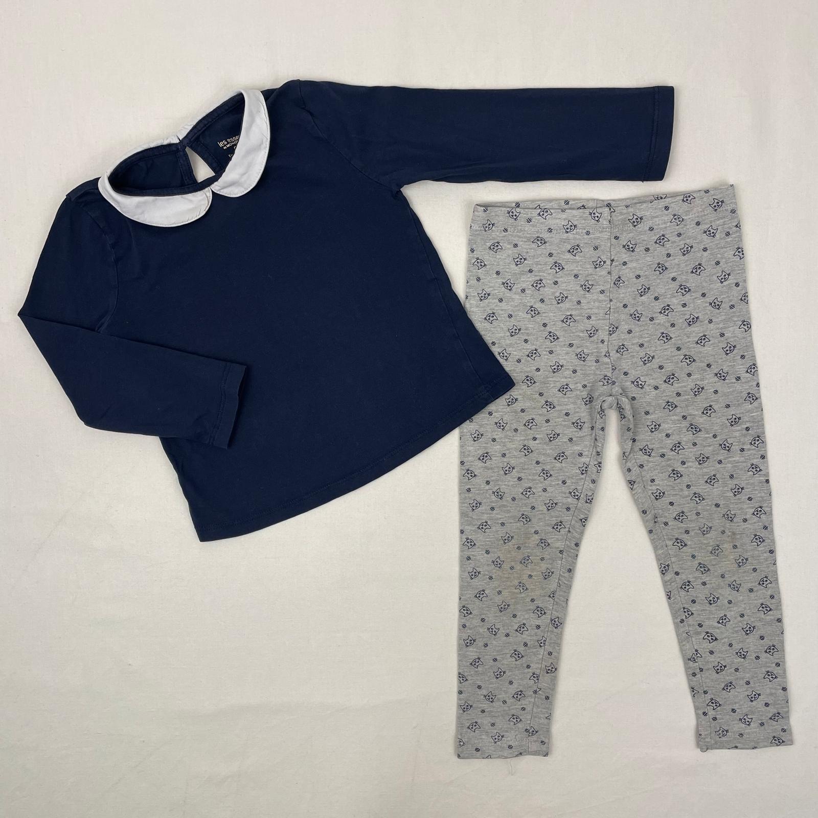 Autres commentaires : Ensemble 2 pièces : -1 T-shirt manches longues Monoprix bleu foncé avec un col claudine blanc avec un bouton derrière, 100% coton, un bouton de remplacement sur une étiquette ; -1 legging gris Bout’chou, 4% viscose, 4% élasthanne.