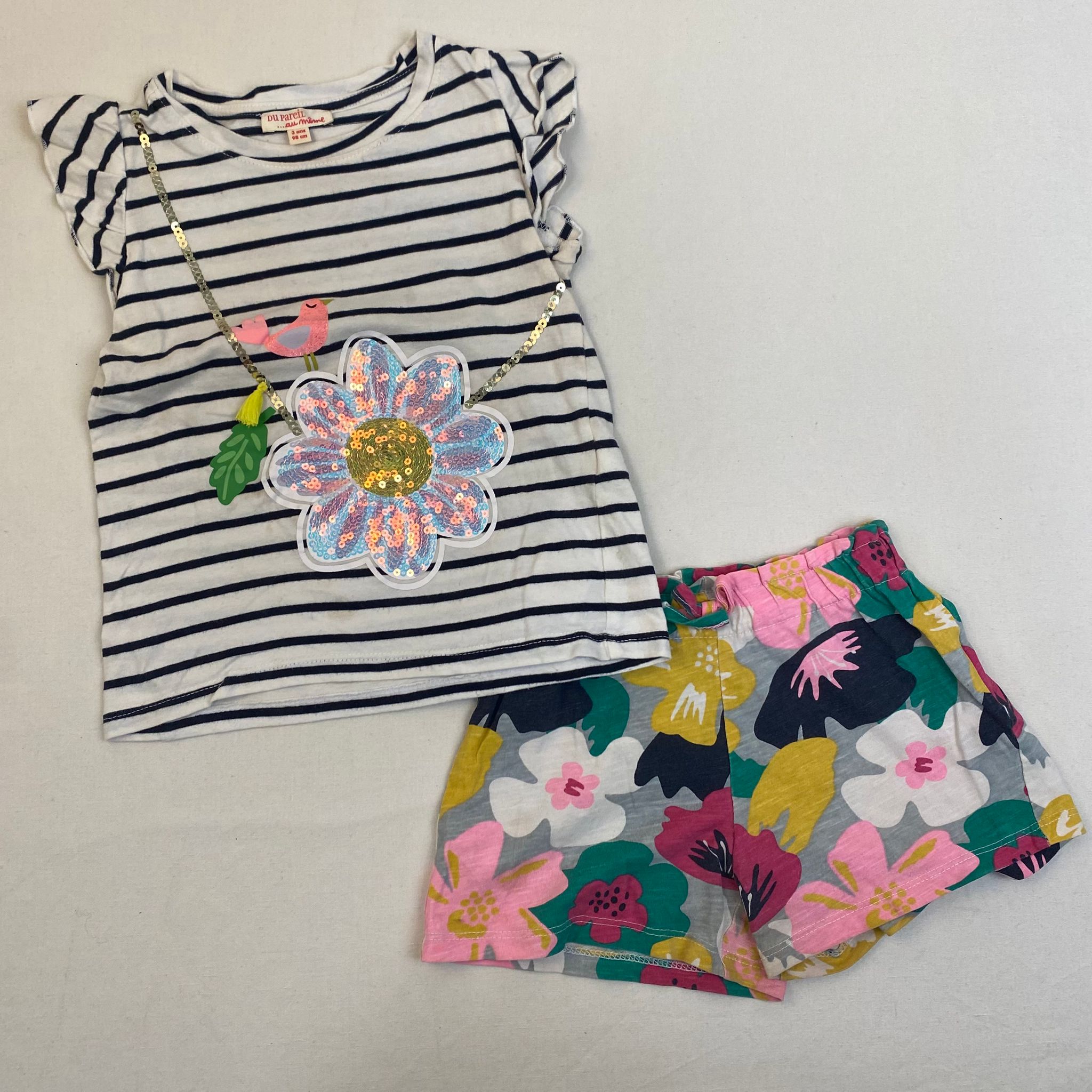 Ensemble 2 pièces : – T-shirt à manches courtes DPAM blanc à rayures bleu foncé, devant fleur en sequins avec oiseau. – Short à fleurs multicolores Gemo, taille élastiquée.
