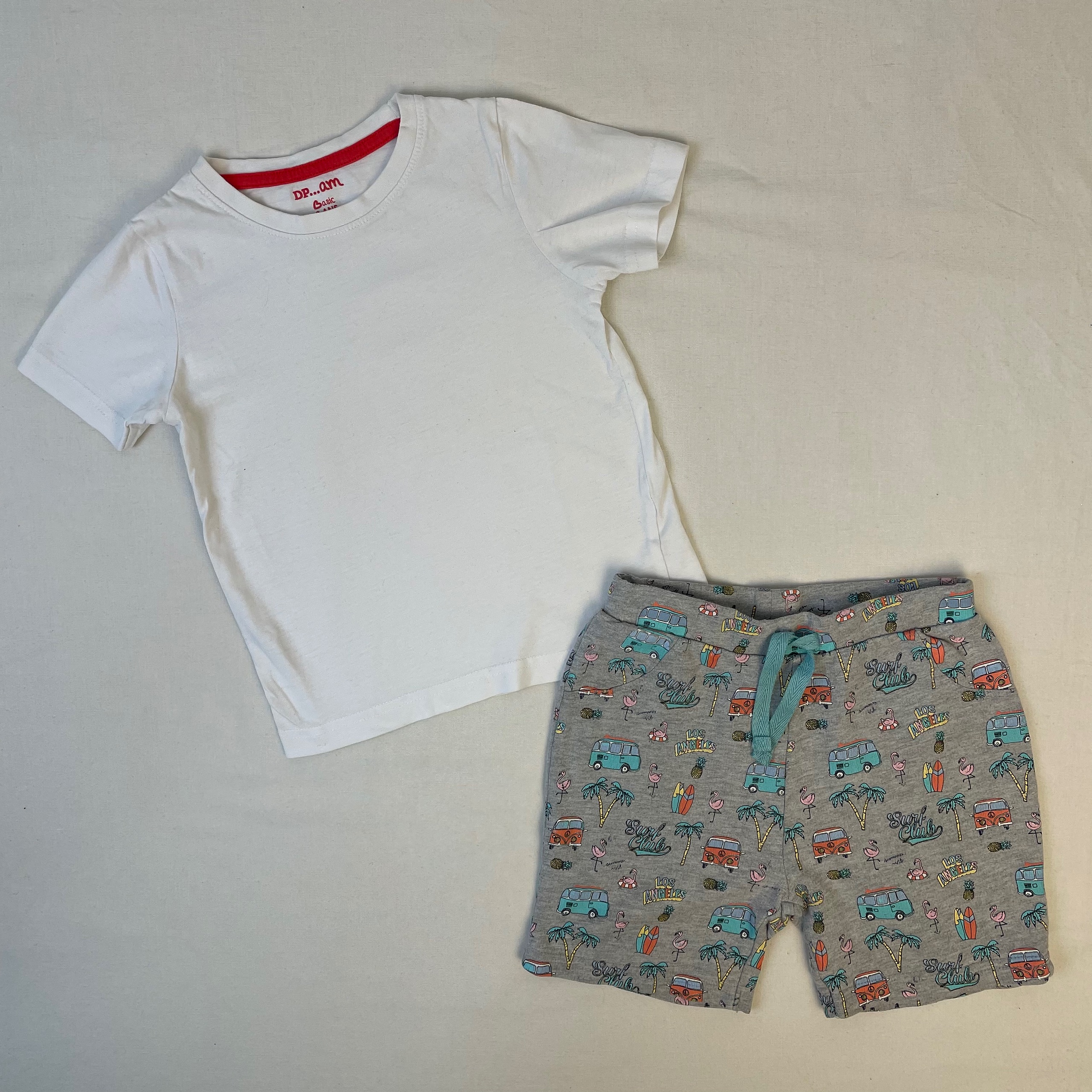 - Short gris avec motif motif colorés de van, de palmier, de flamant rose et de surf pour rappeler les vacanes .