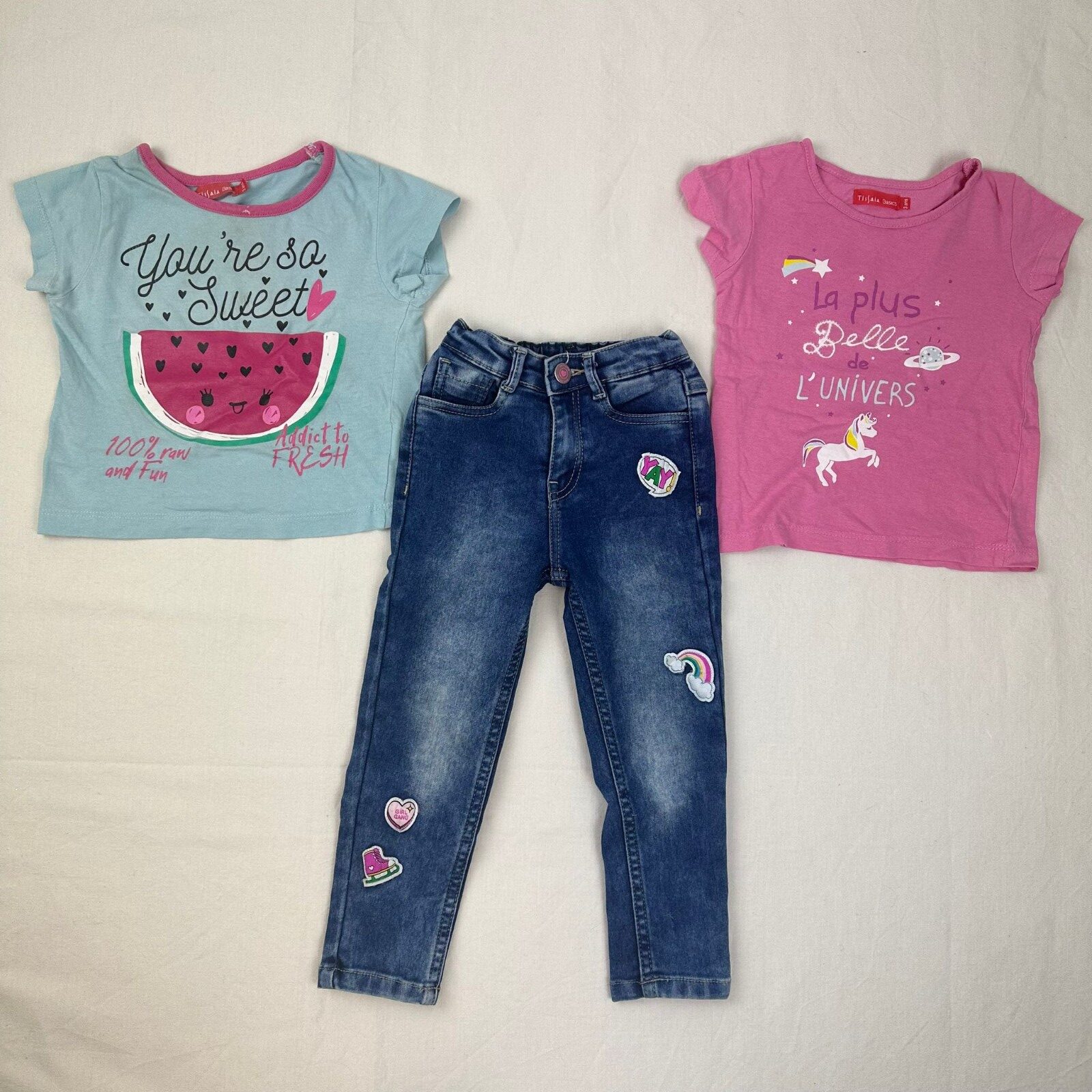 Autres commentaires : 2 t-shirt Tissaia rose et bleu clair avec motif parstéque et licorne. Jean bleu Babyhug avec taille élastiquée et ceinturée.