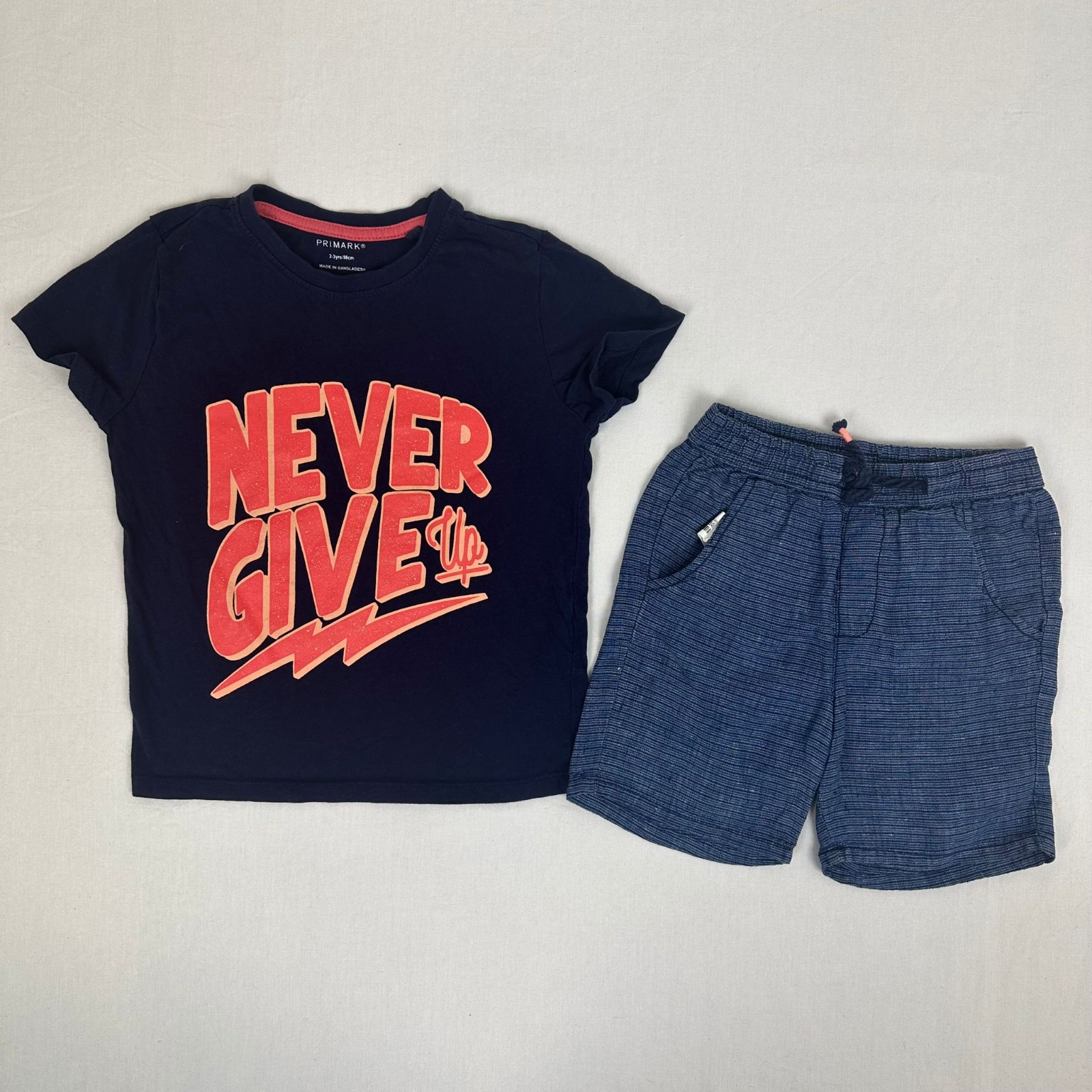 Autres commentaires : T-shirt Primark manches courtes avec motif Never Give Up. Short Zara avec 100% lin et taille élastiquée.