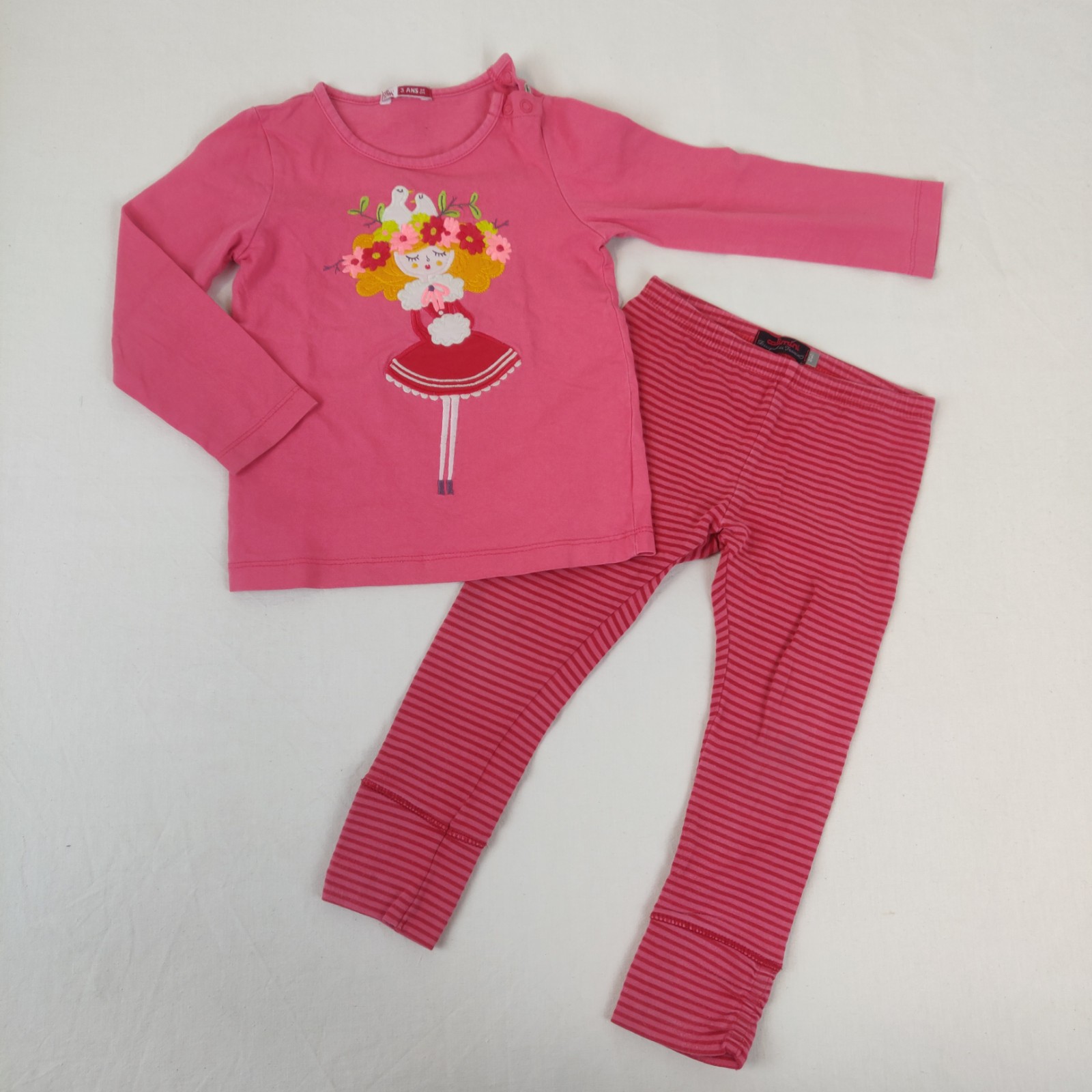 Autres commentaires : 6% élasthanne. Ensemble 2 pièces. Un t-shirt à manches longues Du pareil au même – rose. Motif central petite fille aux oiseaux. Ouverture latérale à 2 pressions. Un legging Catimini – rose rayé bordeaux. Papillons bleus et griffe de la marque au niveau de la jambe droite. Usure normale.