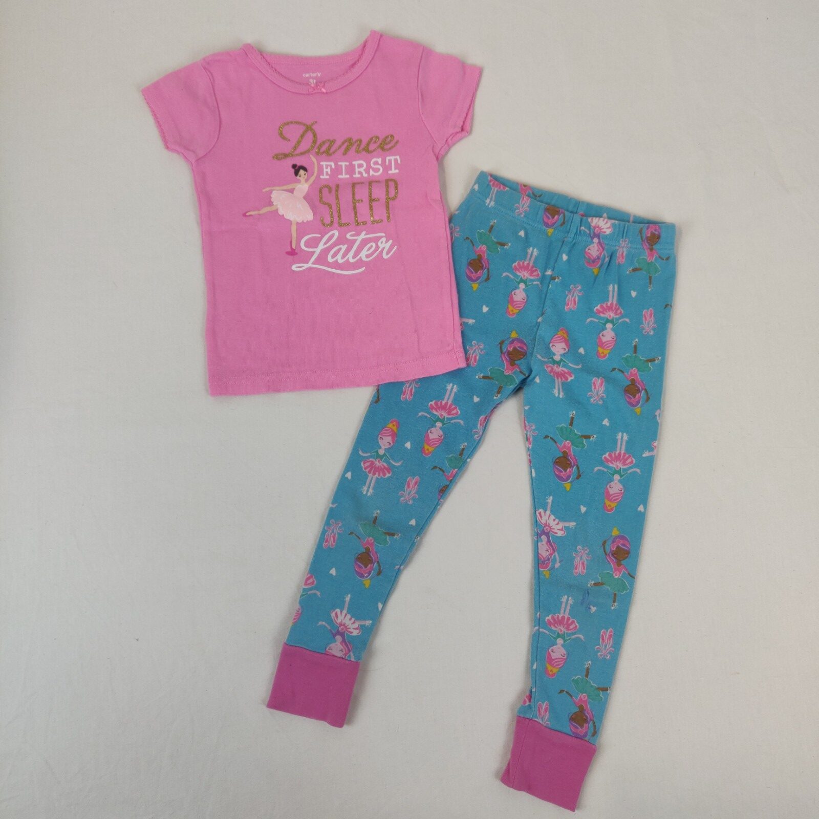 Autres commentaires : Ensemble 2 pièces. Un débardeur Carter’s – rose. Motif central petite sirène accompagné de l’inscription doréee blanche « Dance first sleep later ». Un legging sans marque – bleu. Motifs petites danseuses. Taille élastique. Usure normale.