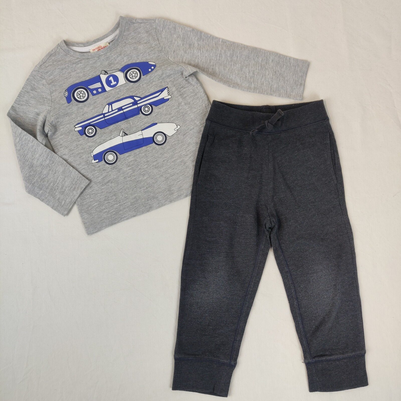 Autres commentaires : Ensemble 2 pièces. Un t-shirt à manches longues Du pareil au même – gris chiné à motifs centraux voitures blanches et bleues. Un pantalon de jogging Gap – gris foncé. Taille élastique. Usure normale du pantalon de jogging.