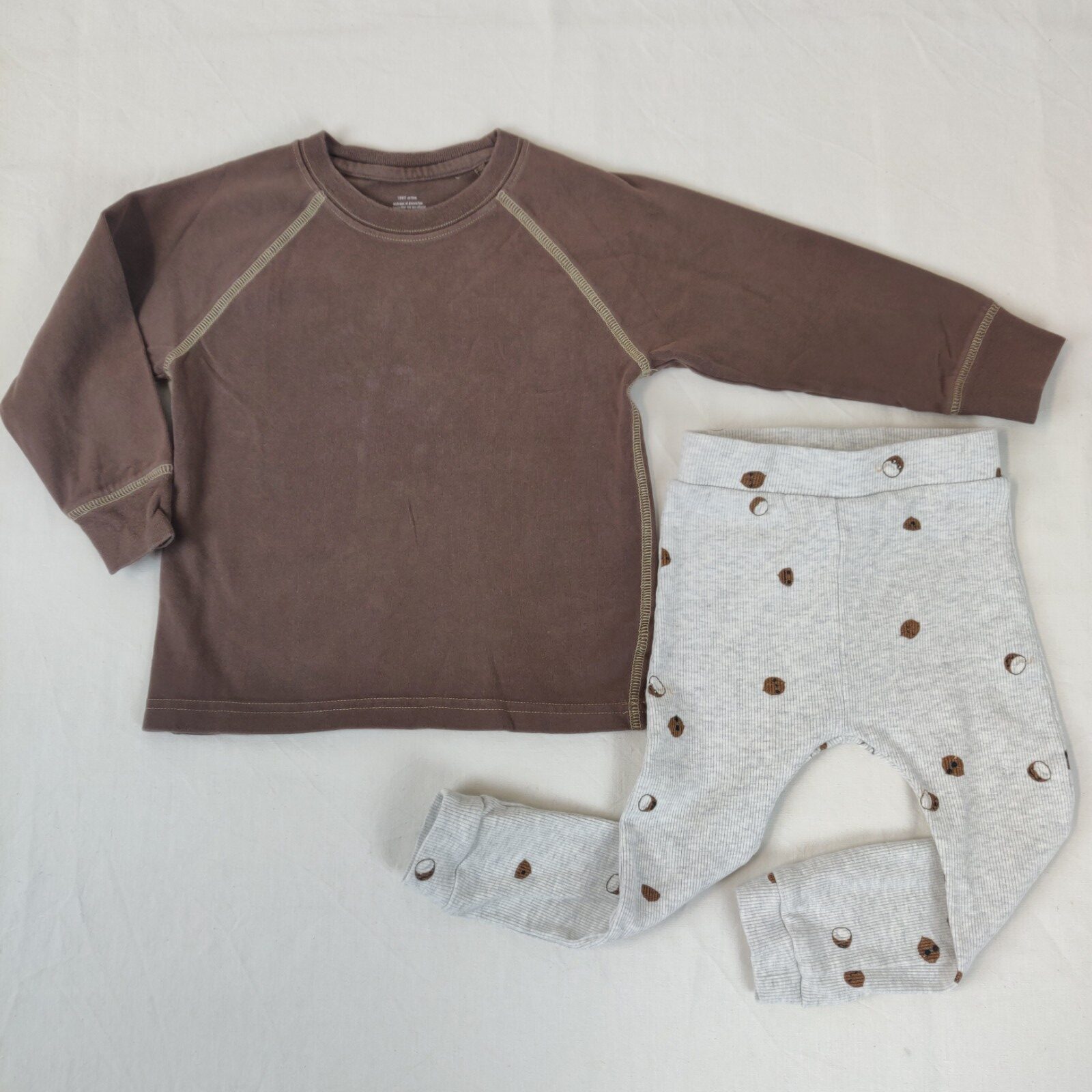 Autres commentaires : Ensemble 2 pièces. Un t-shirt à manches longues Old Navy – marron. Coutures apparentes beiges. Un legging Tu – gris chiné avec motifs noix de coco marrons. Taille élastique.