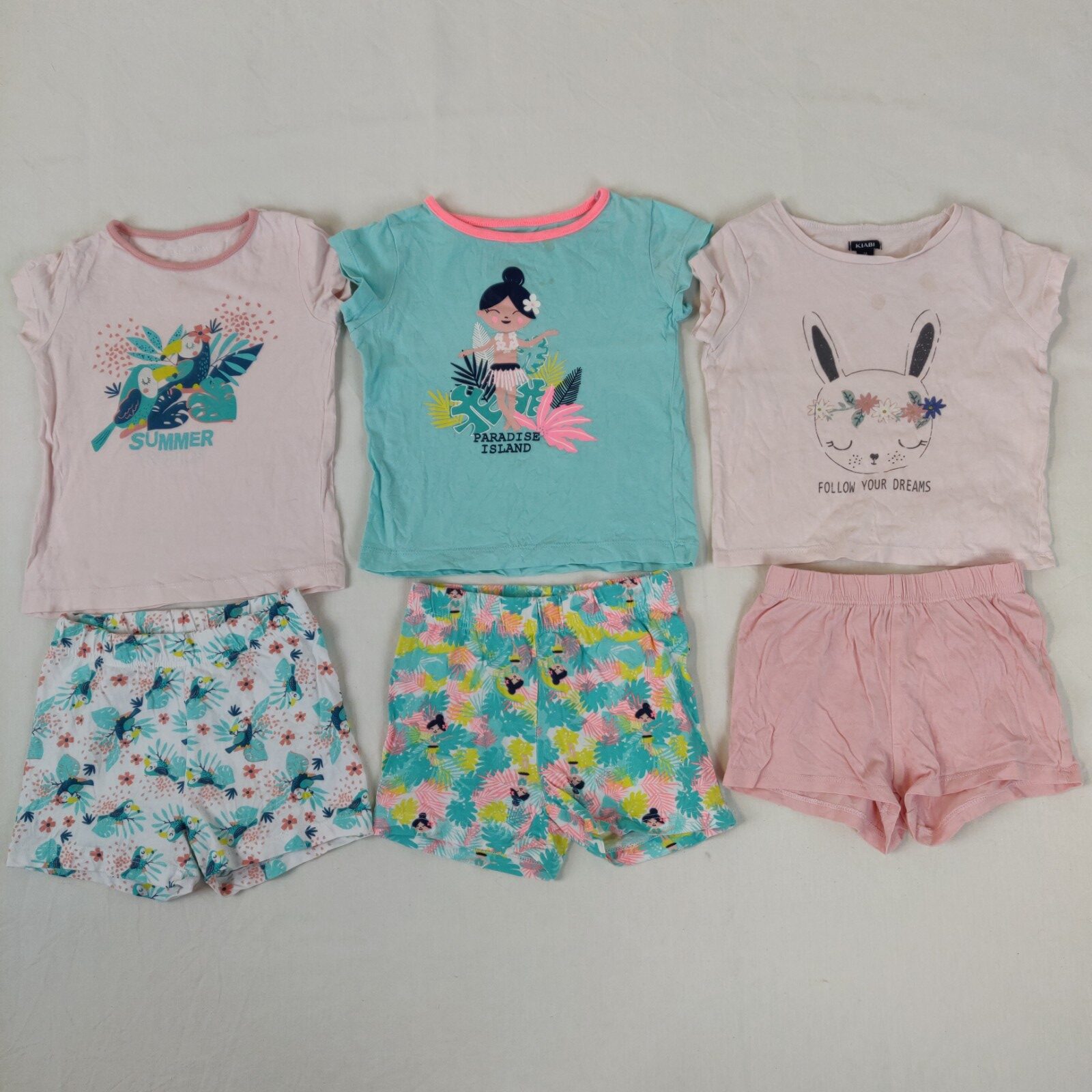 Autres commentaires : Lot de 3 ensembles 2 pièces composés d’un t-shirt à manches courtes et d’un short assorti. Premier ensemble In extenso : un t-shirt bleu à motif danseuse hawaïenne accompagné de l’inscription « Paradise island ». Quelques tâches marronées. Short assorti avec taille élastique. Deuxième ensemble In Extenso. T-shirt rose à motifs toucans au milieu des feuillages accompagnés de l’inscription « Summer tropics ». Une tâche marronée près du col et une tâche de feutre. Short blanc assorti. Taille élastique. Troisième ensemble kiabi. Un t-shirt rose à motif central lapine coquette accompagné de l’inscription « Follow your dreams ». Plusieurs tâches. Short assorti. Taille élastique. Niveau réduit de fraise à myrtille.
