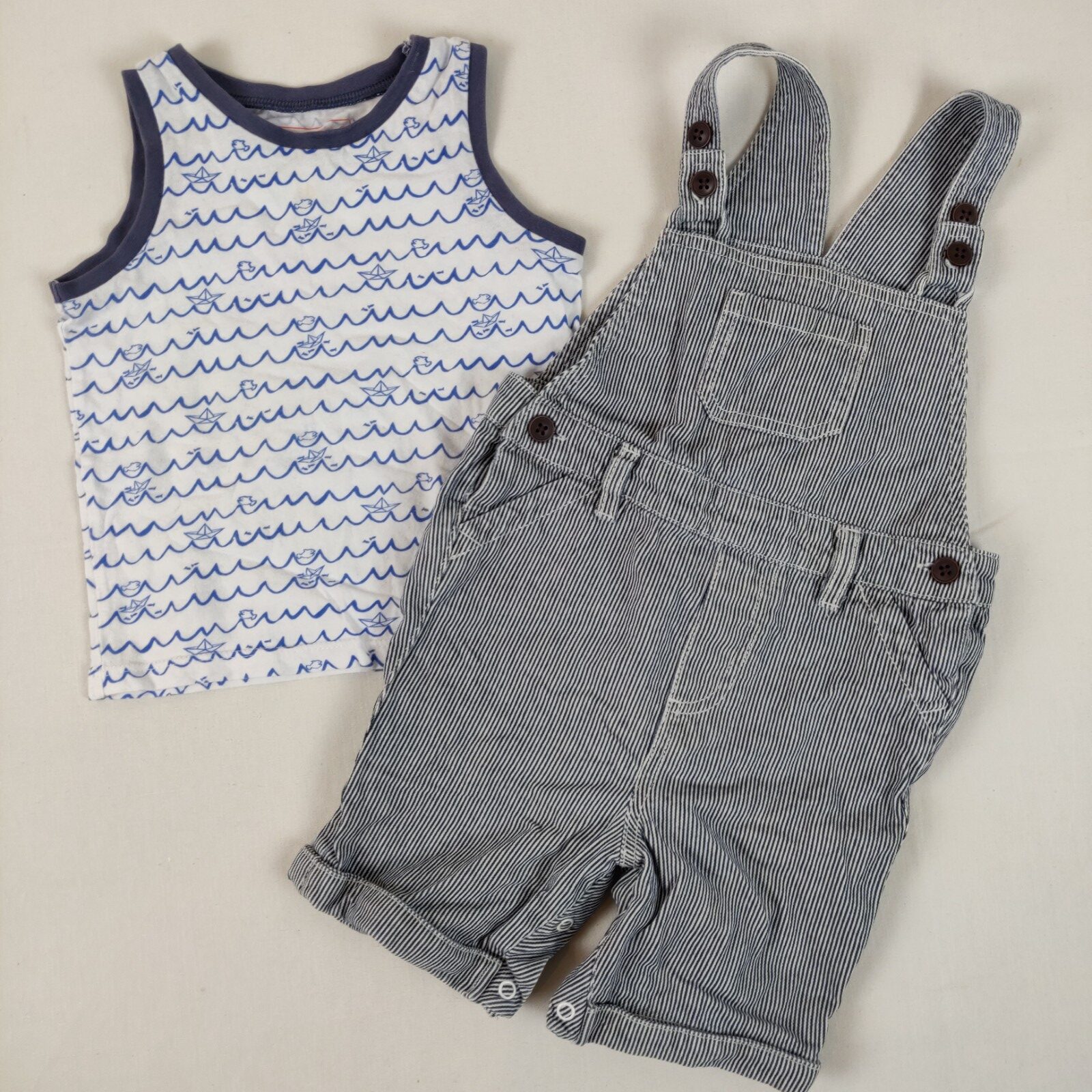 Autres commentaires : Ensemble 2 pièces. Un débardeur In Extenso blanc avec des motifs marins bleus. Tâche très discrète sur le devant. Salopette Primark à bretelles réglables à deux boutons – rayée finement verticalement blanc et bleu. Une pochette centrale. Ouvertures latérales à un bouton. 2 poches latérales en trompe-l’oeil et une poches arrière. Ouverture à l’entrejambe à pressions. Passants pour une ceinture.