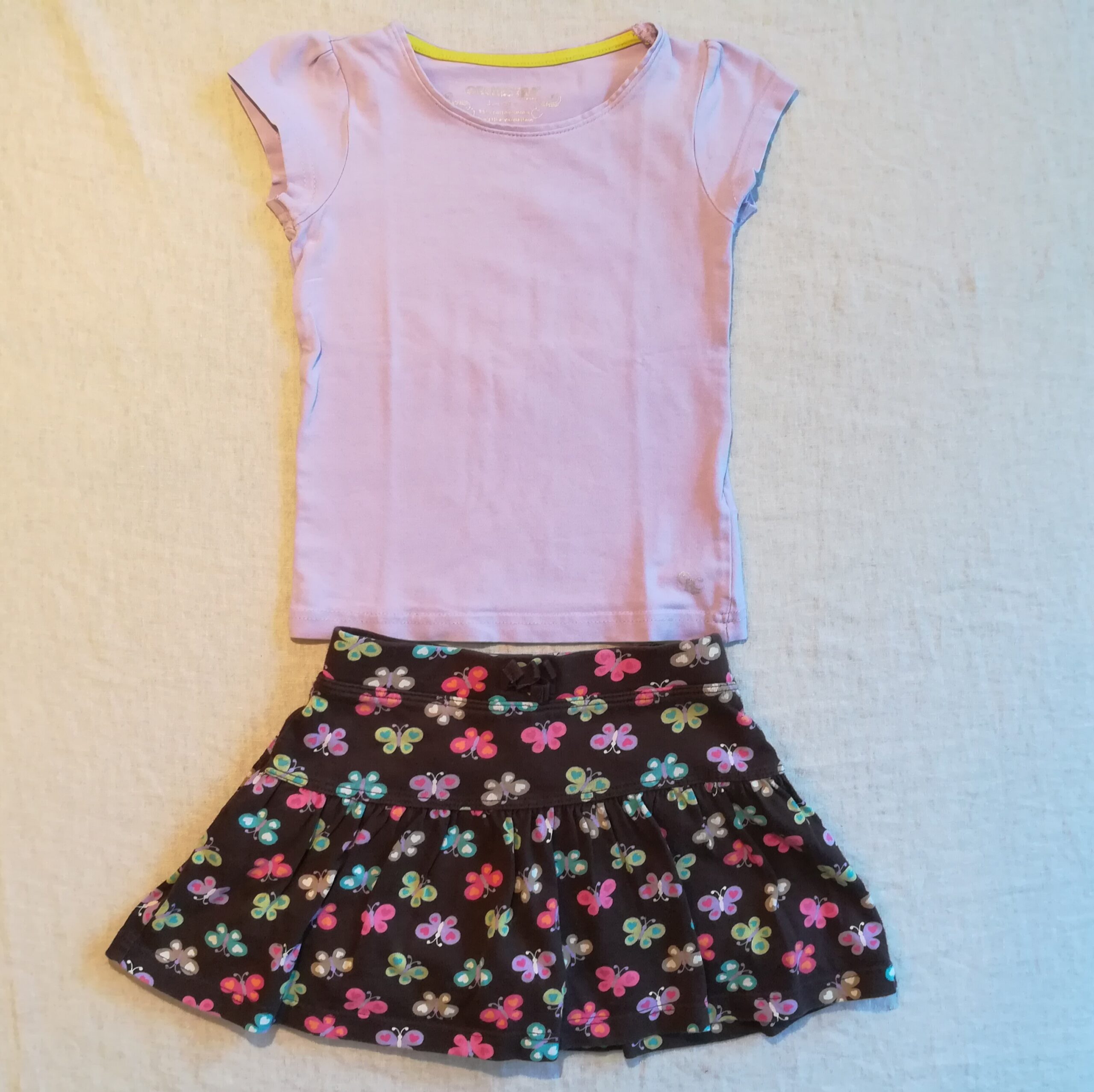 Autres commentaires : T-shirt manches courtes violet uni Orchestra 5% élasthanne, jupe marron Jumping Beans à papillons multicolores, short intégré, taille élastique