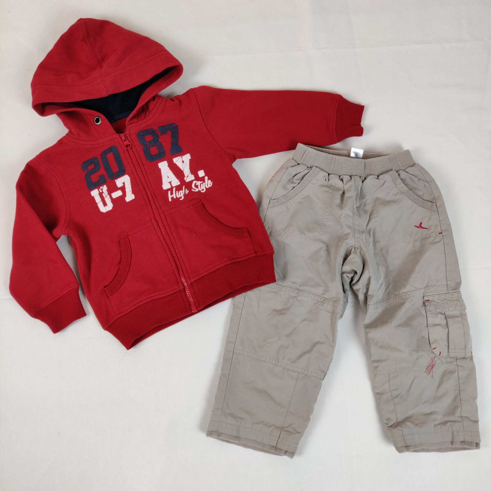 Autres commentaires : Ensemble 2 pièces. Gilet à capuche In Extenso – rouge avec inscription grise et blanche « 2087 U-7 AY. High Style ». 2 poches latérales. Poignets et taille façon tricot élastique rouge. Pantalon doublé « Decathlon » (polyester majoritaire, coton 20%, polyamide 20%) – beige. Taille élastique. 2 poches latérales et une poche à rabat au niveau du genou gauche.