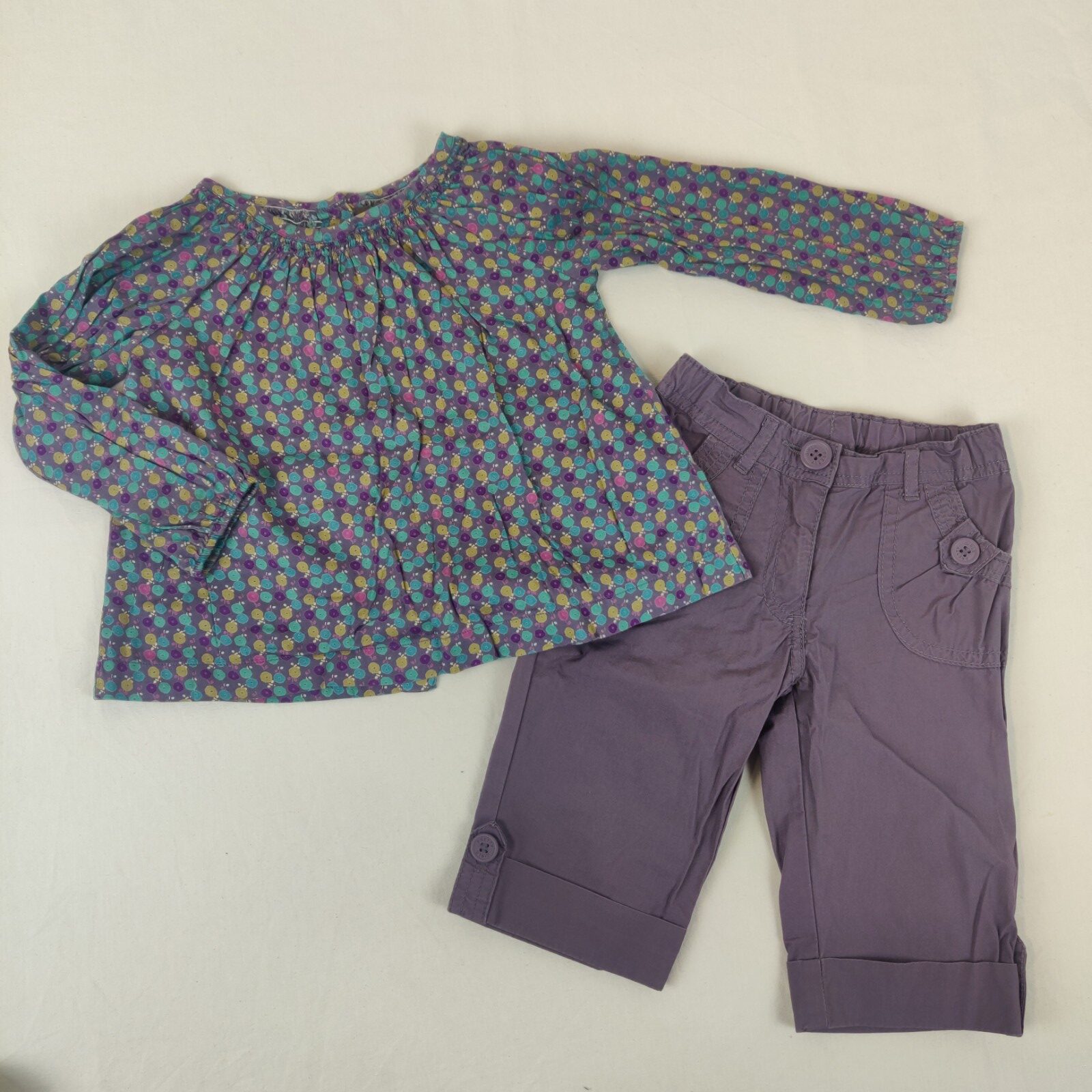 Autres commentaires : Ensemble 2 pièces. Une blouse à manches longues Bout’chou. – violet. Motifs floraux multicolores. Ouverture centrale au dos à boutons. Pantalon sans marque- violet. Taille ajustable. 2 poches latérales et 2 poches arrières à rabat. Chevilles retroussées.