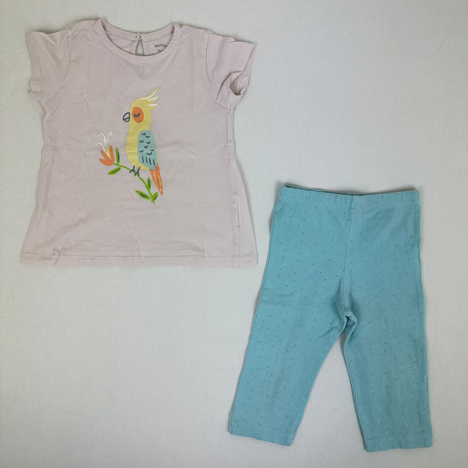 Autres commentaires : 4% elasthanne. Legging bleu Mots d’enfant. T-shirt manches courtes Bout’chou rose avec motif perroquet