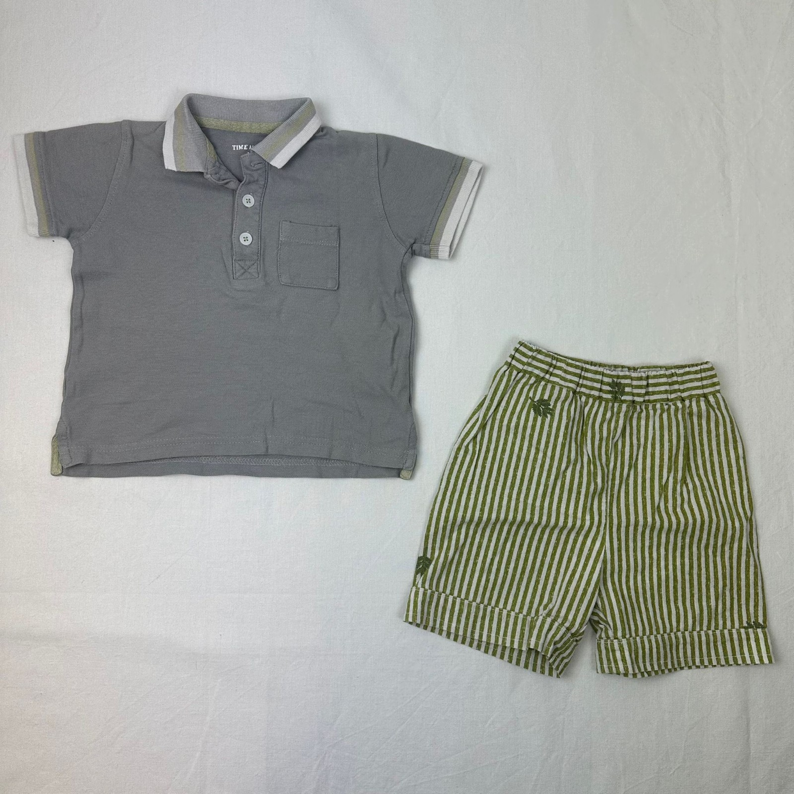 Autres commentaires : Polo manches courtes gris Time after Time avec une fermeture au col par boutons. Short sans marque vert avec rayures blanches et taille élastiquée.