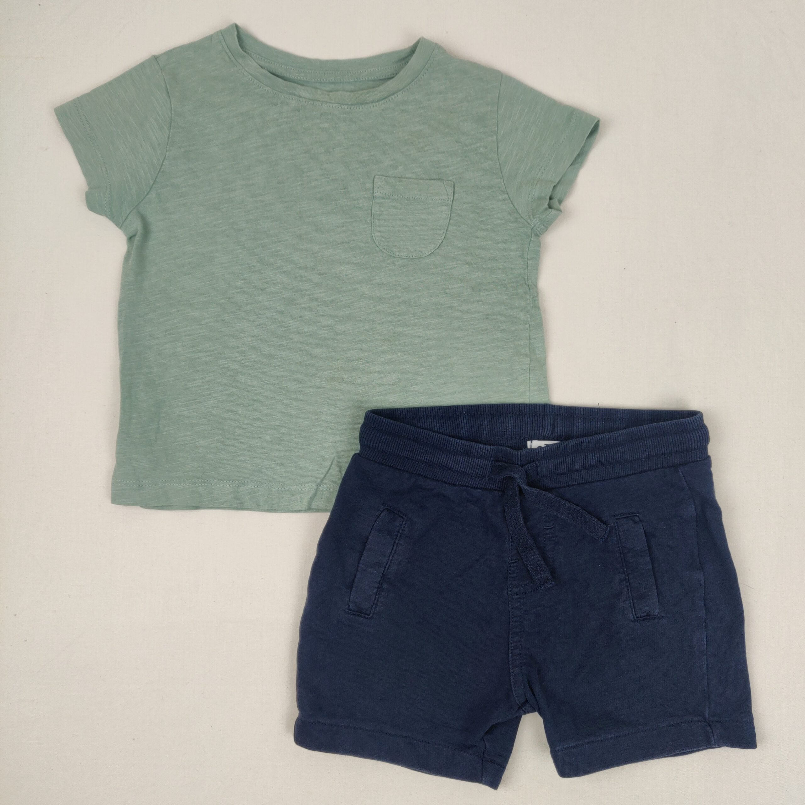 Autres commentaires : Short bleu marine taille élastiquée et avec 2 cordons – T-Shirt Monoprix vert tilleul en 100% coton biologique