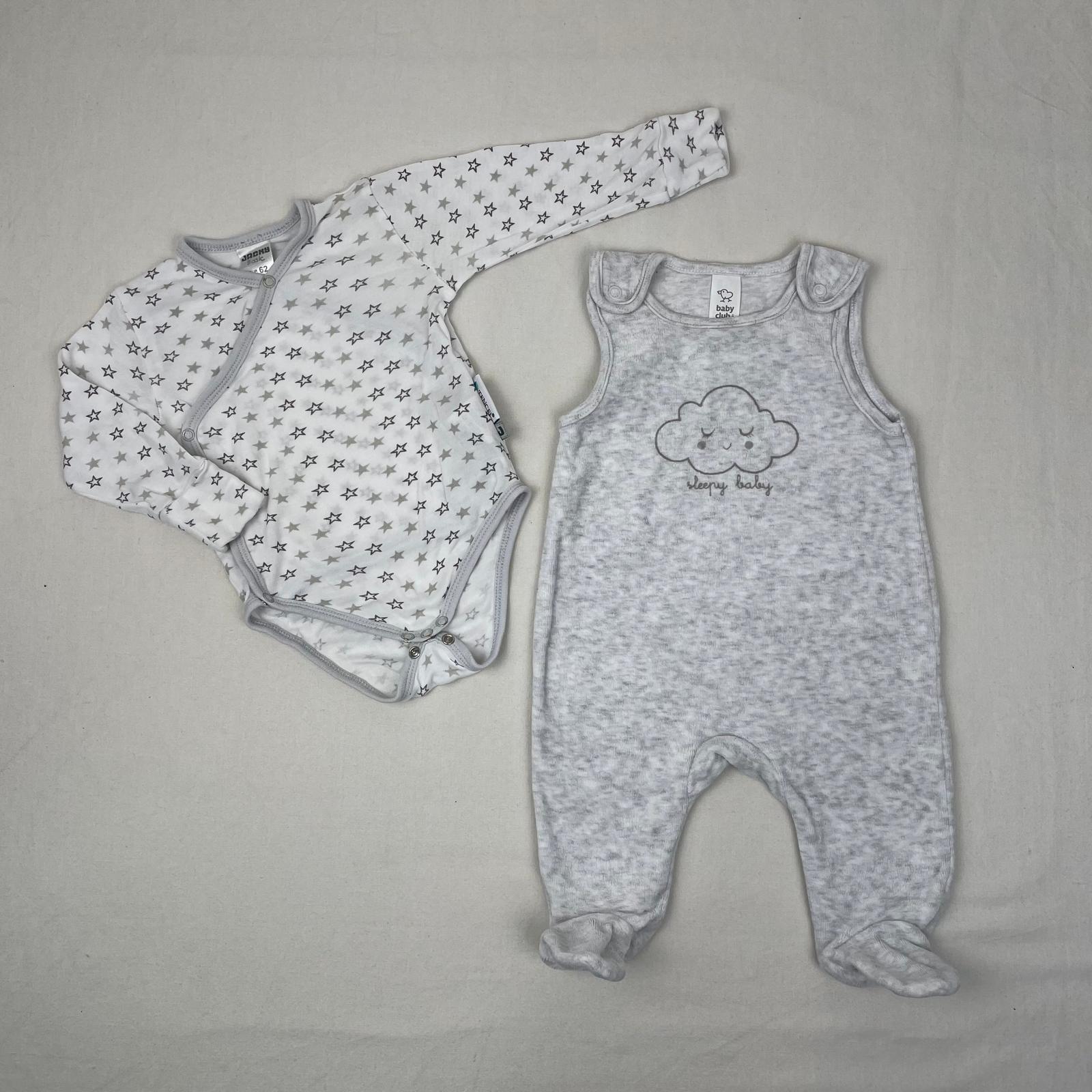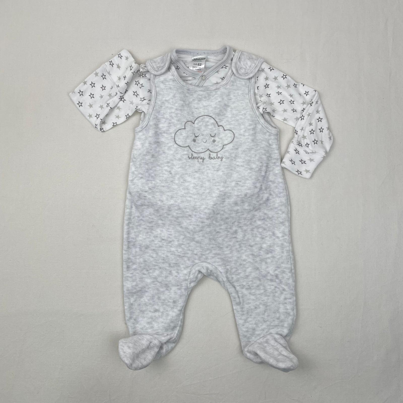 Autres commentaires : Ensemble 2 pièces : – 1 combinaison longue sans manches gris clair Baby Club (C&A) 24% polyester, avec pieds, en velours, avec boutons pression aux épaules, motif nuage devant et inscription « Sleepy baby ». – 1 body blanc Jacky Baby 100% lyocell, parsemé d’étoiles grises, encolure croisée, boutons pression à l’entrejambe.