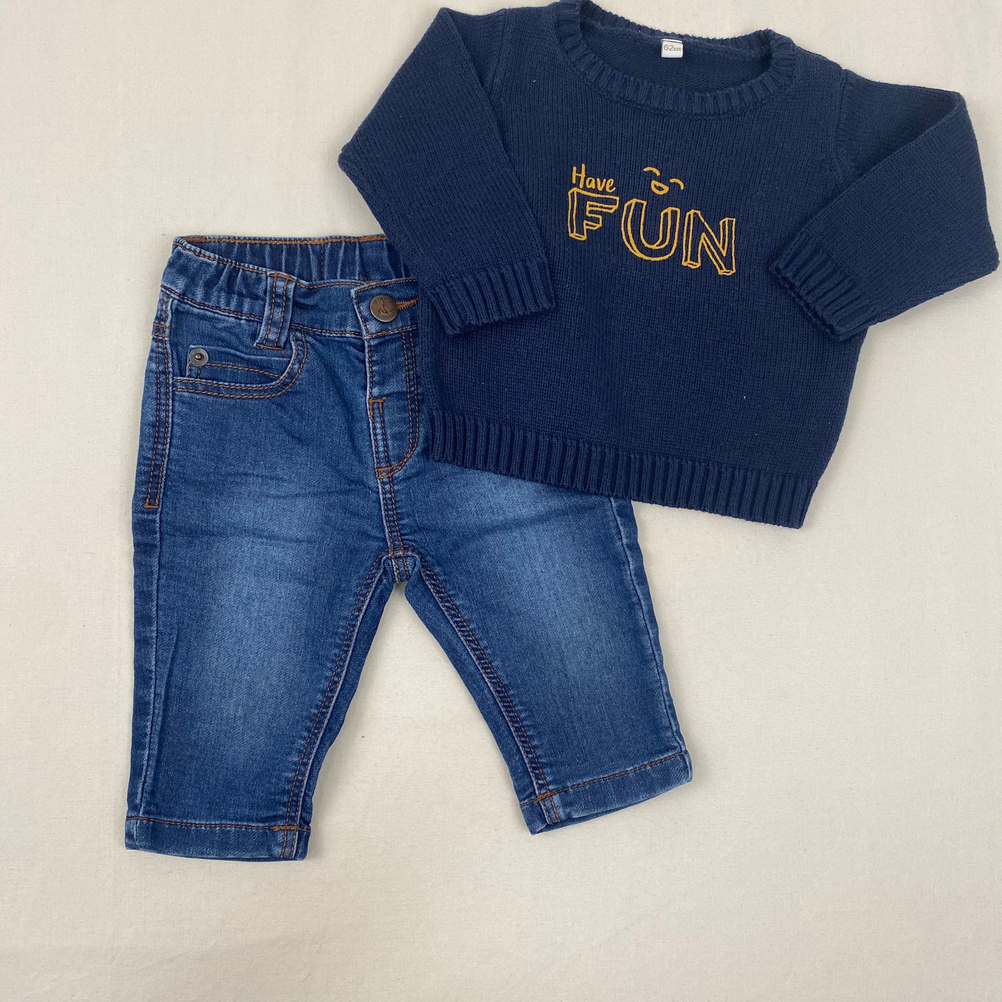 Autres commentaires : Ensemble Pull bleu marine avec inscription en jaune « have fun » à l’avant 50% polyester. Jean Grain de Blé, fermeture par bouton pression à la taille, poches à l’avant et à l’arrière. 34 % polyester, 1 % élasthanne.
