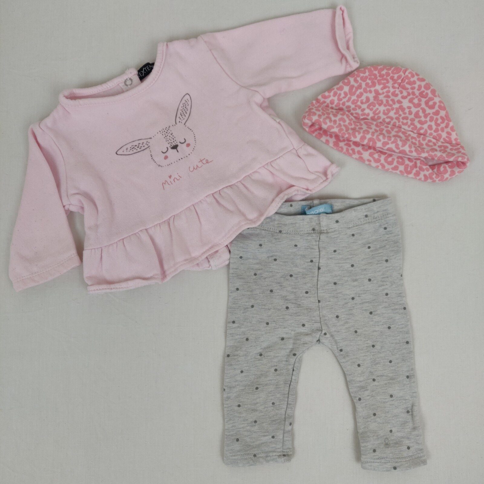 Autres commentaires : T-shirt rose In extenso manches longues avec une fermeture au dos par boutons pressions avec motif un lapin. Legging Obaibi gris avec des points gris foncés avec taille élastiquée. Bonnet blanc et rose de Carter’s offert.