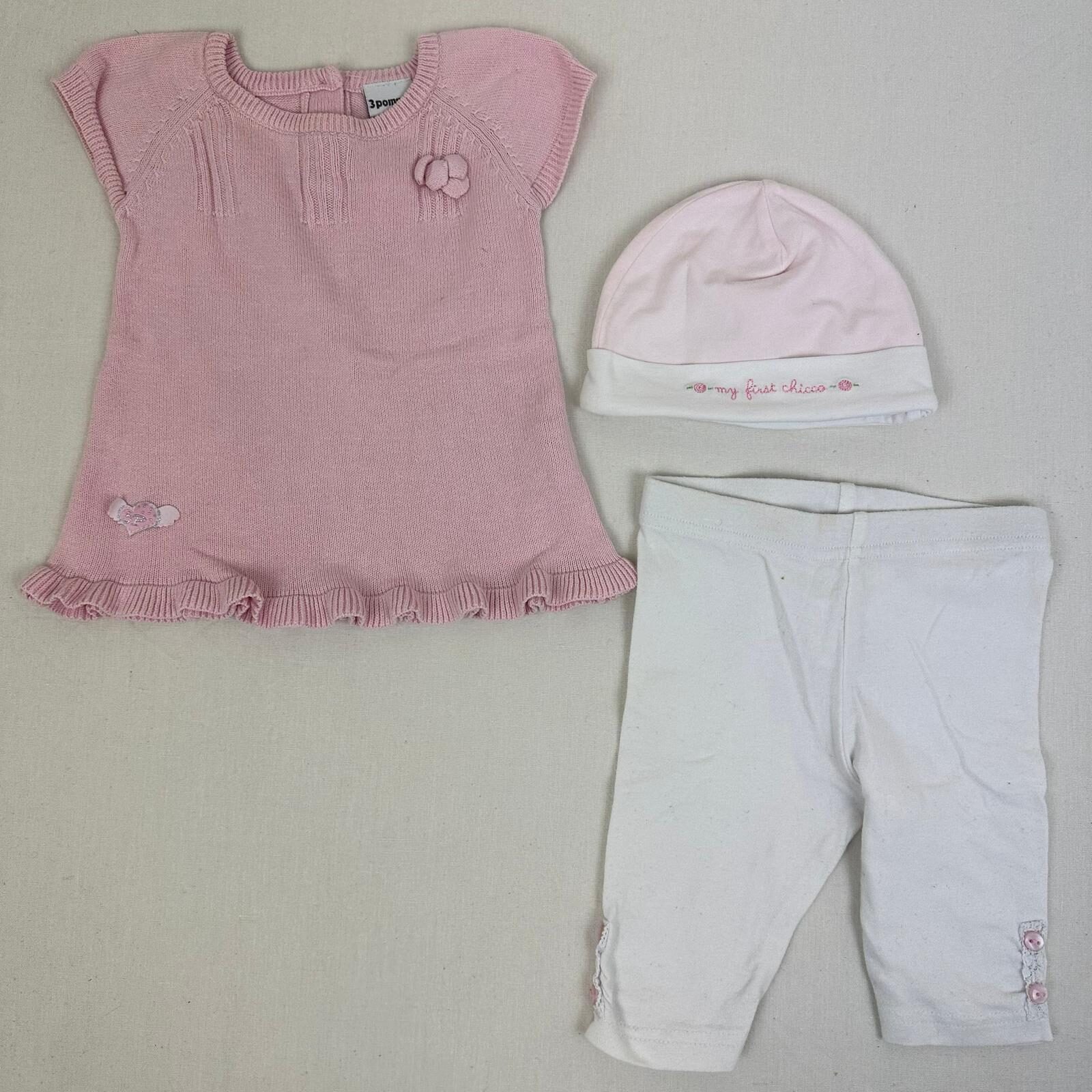 Autres commentaires : 4% elasthanne .T-shirt 3 pommes rose manches courtes avec une fermeture au dos par boutons. Legging sans marque avec taille élastiquée. Bonnet My First Chicco rose offert.