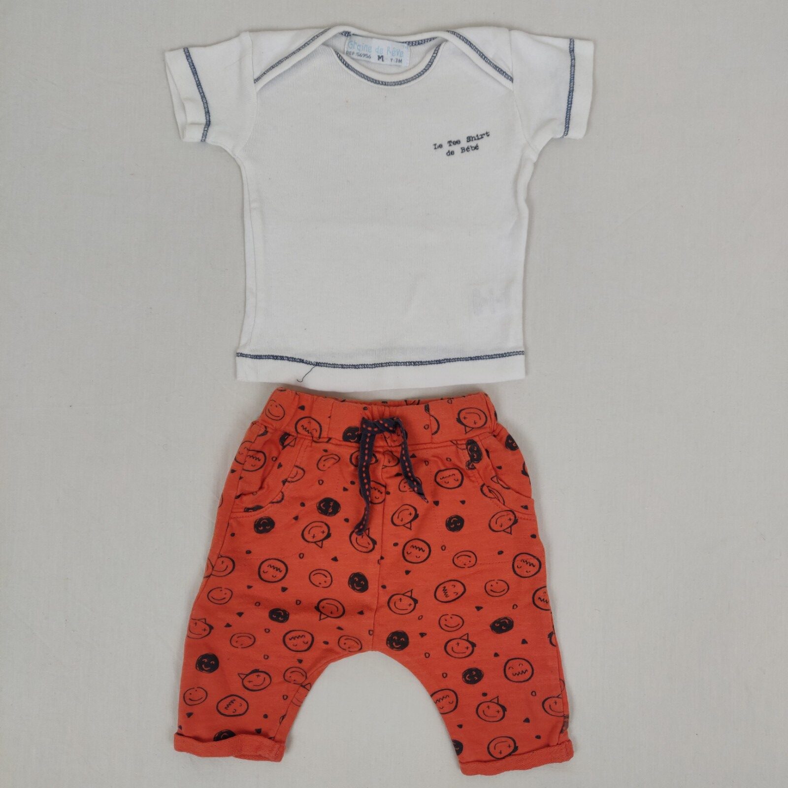 Autres commentaires : Jogging orange Kiabi avec motifs d’emoji noir. T-shirt blanc Graine de rêve manches courtes.